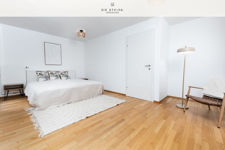 Die Schlafetage verfügt über ein Schlafzimmer mit Zugang zum eigenen Balkon, ein weiteres Zimmer (derzeit als Kinderzimmer genutzt) sowie ein stilvolles Bad mit Wanne, Dusche und Waschbecken.