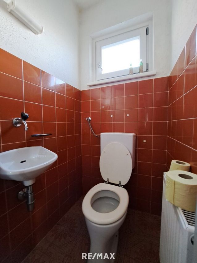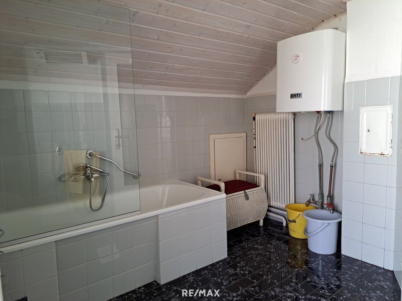 Die Liegenschaft ist laut Verkäufer an die öffentliche Wasserversorgung und das Kanalnetz angeschlossen. Das Badezimmerwasser wird derzeit in einen Regenwasserkanal geleitet. Das mit Eternit gedeckte Dach wirkt augenscheinlich dicht, wobei ein zukünftiger Sanierungsbedarf nicht ausgeschlossen werden kann.