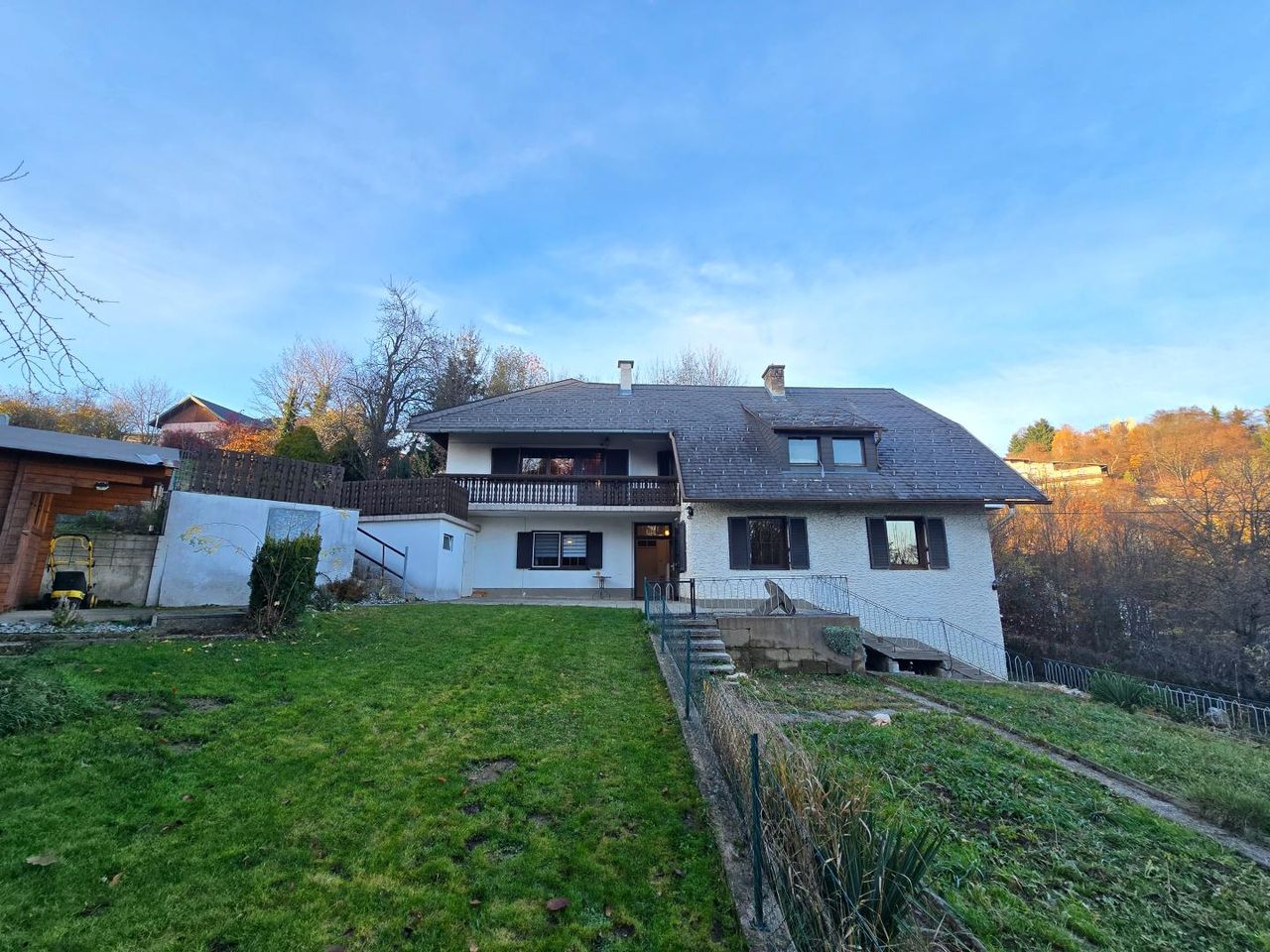 Das Haupthaus stammt aus dem Jahr 1948 und wurde 1971 durch eine Stützmauer sowie 1979 durch einen gedämmten Wohnzubau erweitert. Beide Wohneinheiten sind sowohl vom Erdgeschoss als auch vom Obergeschoss aus begehbar und eignen sich ideal für Familien, Mehrgenerationenwohnen oder als Kombination aus Wohnen und Arbeiten.