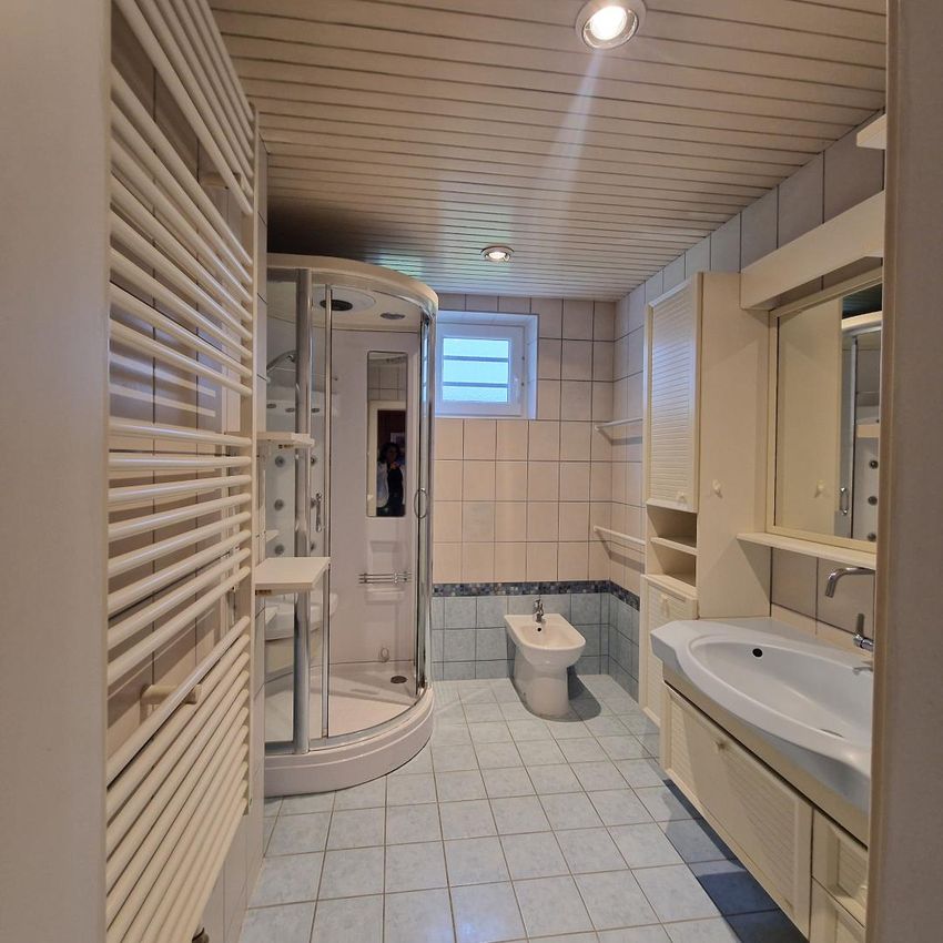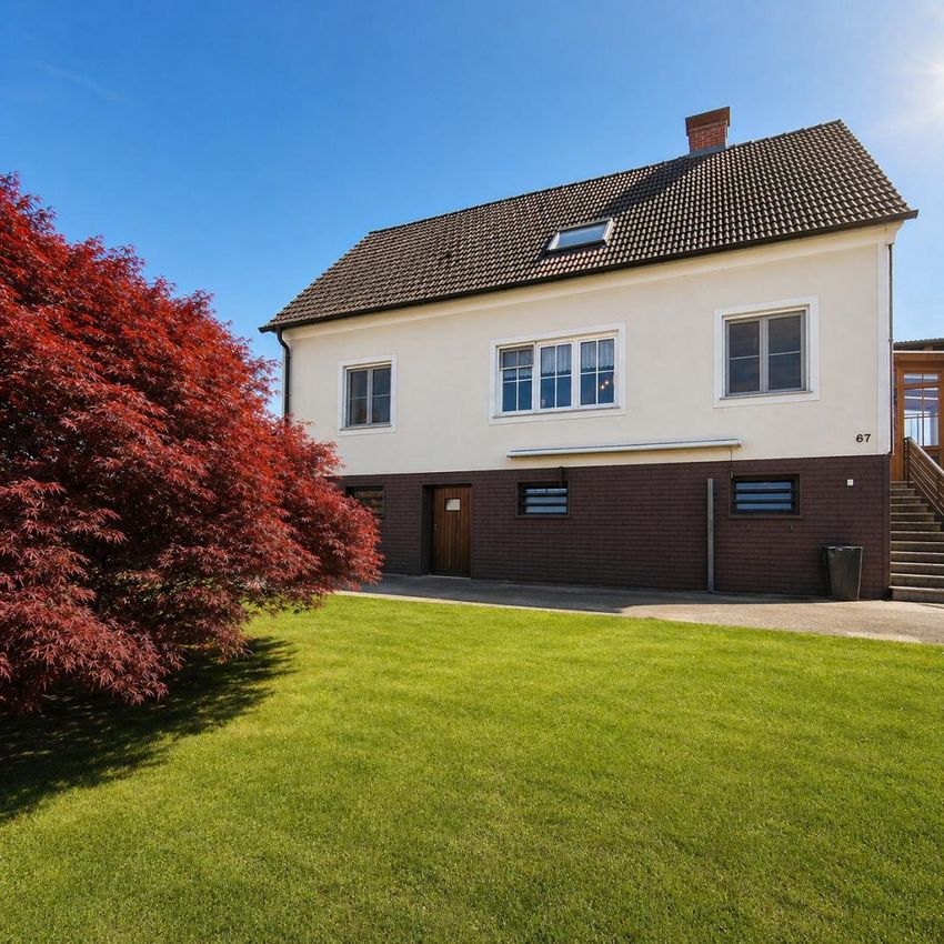 Heute erstreckt sich das Haus über zwei Ebenen und bietet durch zwei Küchen die Möglichkeit zur Nutzung als zwei getrennte Wohneinheiten. Mehrere Wohn- und Schlafräume, zwei Badezimmer sowie zusätzliche WCs ermöglichen ein komfortables Zusammenleben – ideal für Familien oder Mehrgenerationenlösungen.