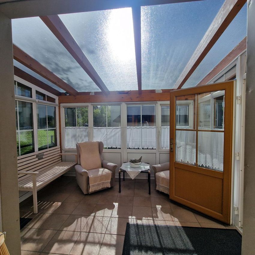 Die Innenräume präsentieren sich gepflegt und vermitteln durch warme Holzdecken und helle Räume eine angenehme Wohnatmosphäre. Besonders hervorzuheben ist der lichtdurchflutete Wintergarten, der den Wohnraum erweitert und einen fließenden Übergang in den Garten schafft.