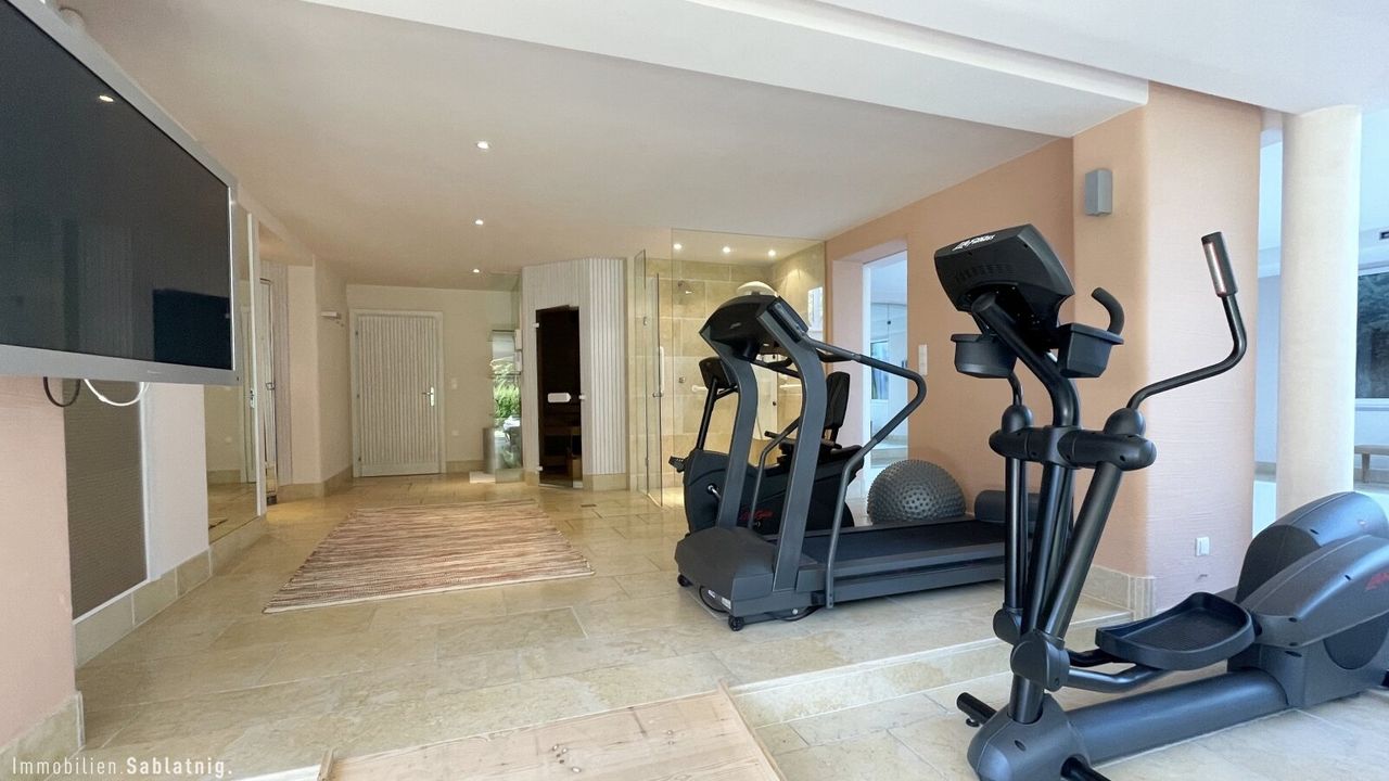 Der gediegene Stil dieser Villa verbindet hochwertige Materialien mit außergewöhnlicher Eleganz. Ein privater Indoorpool, ein Fitnessbereich, eine großzügige Saunalandschaft und ein gemütlicher Loungebereich bilden eine echte Wellnessoase für Körper und Geist.