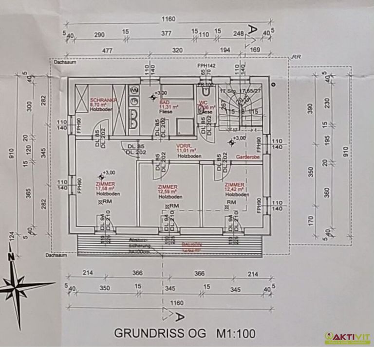 Das Obergeschoss umfasst drei weitere Zimmer, ein Badezimmer, ein separates WC, einen Schrankraum sowie einen zentralen Vorraum. Die Räume sind funktional angeordnet und überwiegend zentral begehbar.