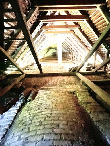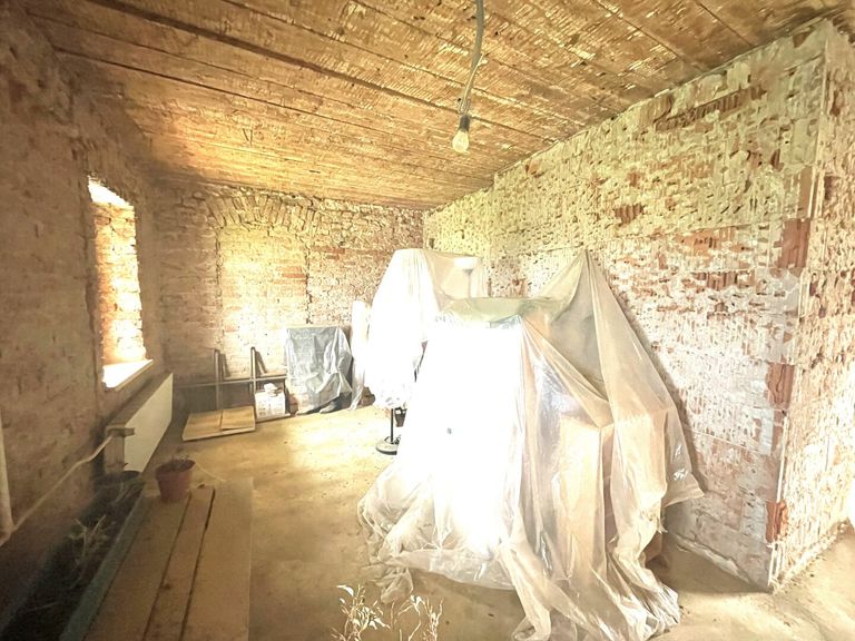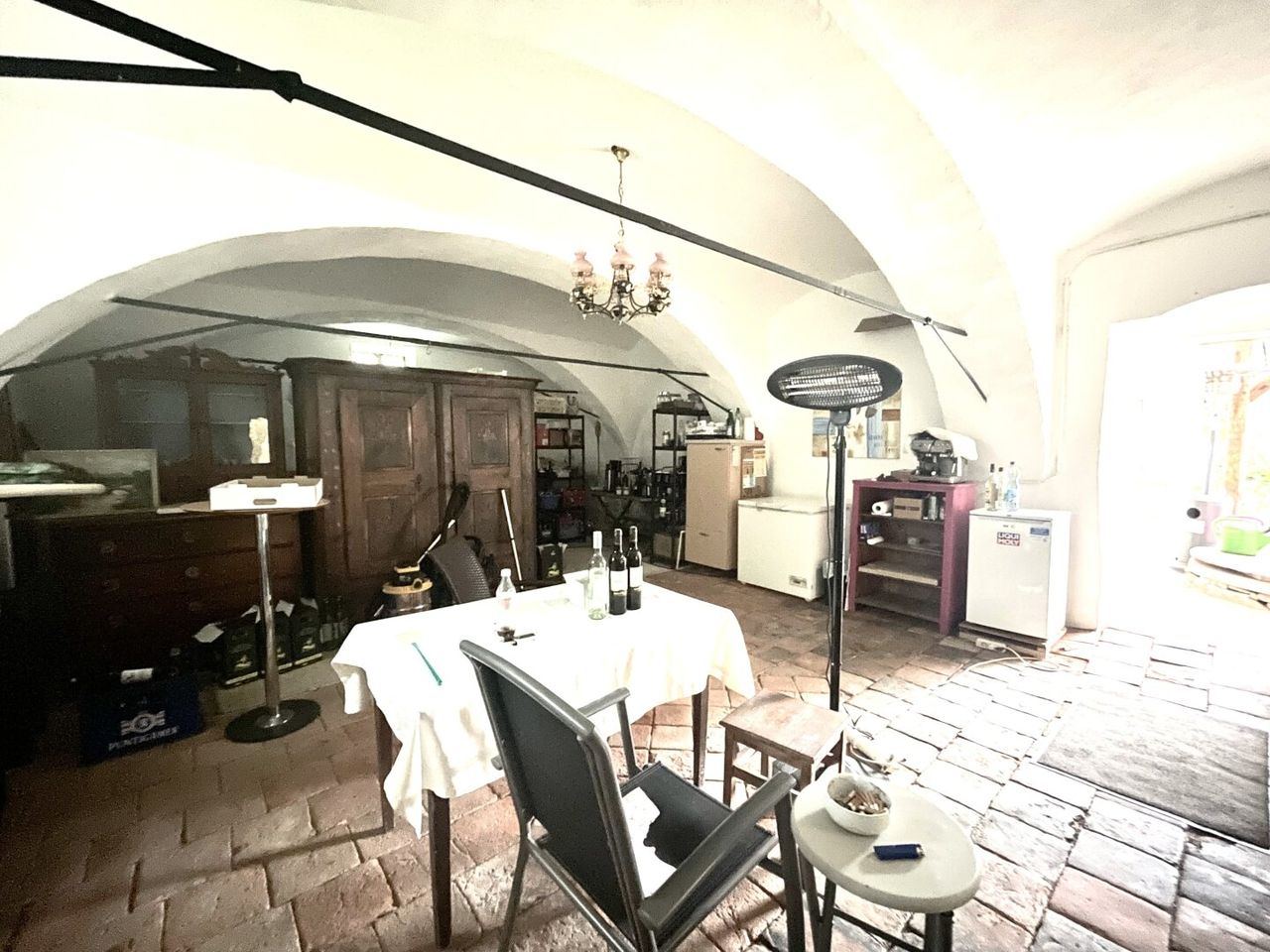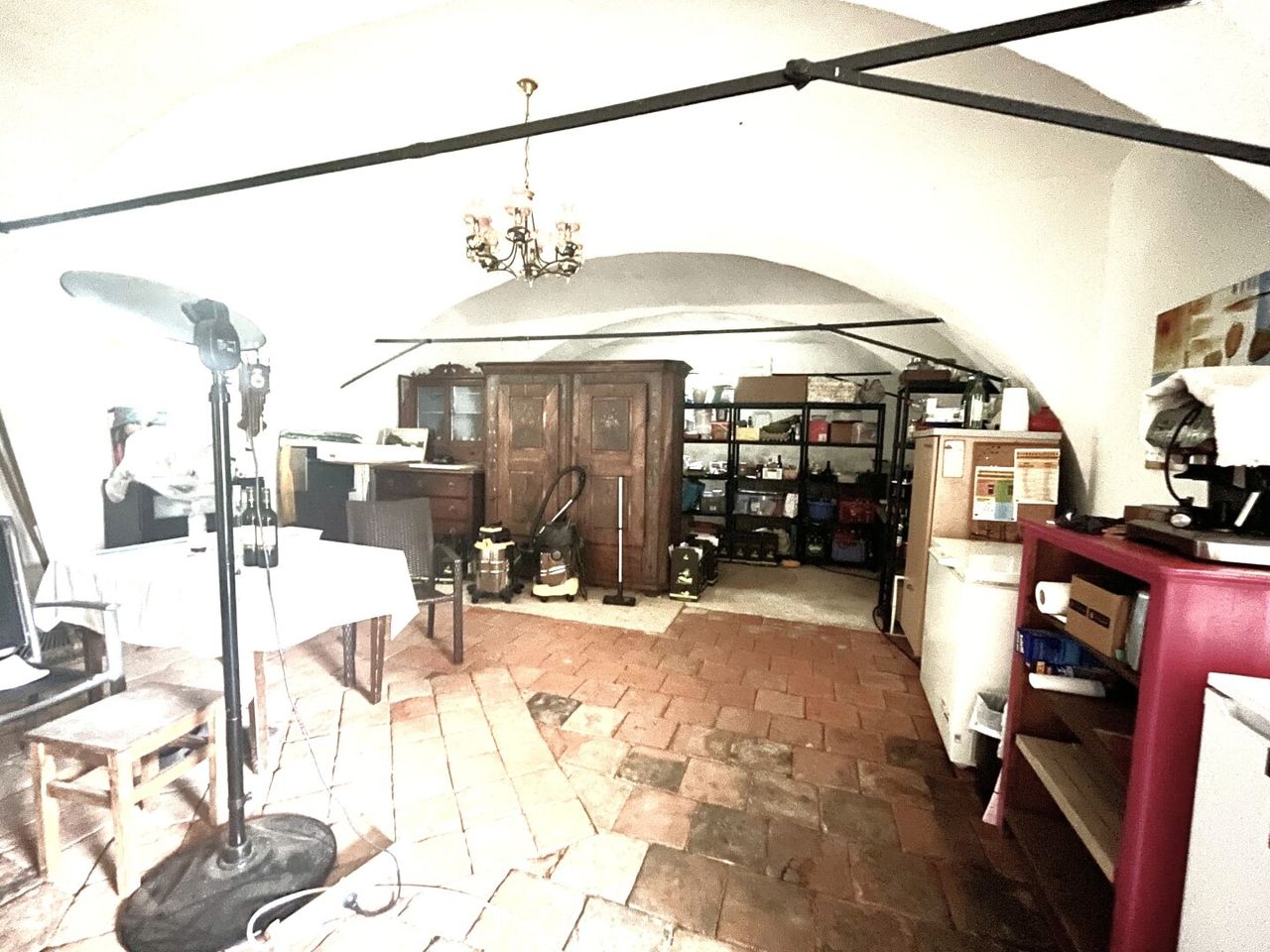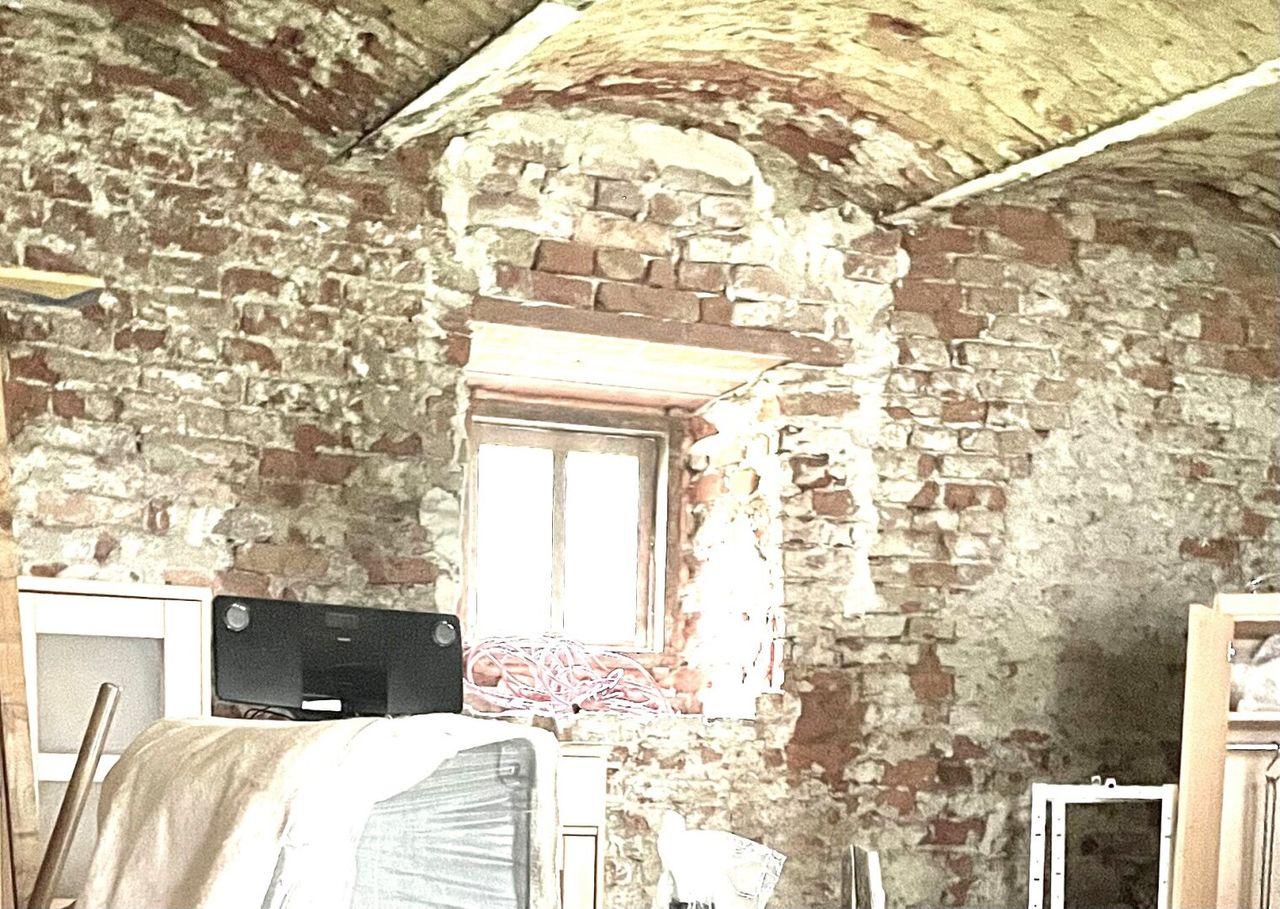 *Erstes Zimmer: Angrenzend an die sanierte Wohneinheit befindet sich das erste sehr große Gewölbedeckenzimmer mit dem antiken handgefertigten Ziegelfließenboden und direktem Zugang zum Innenhof. Derzeit dient es der Familie als Lagerraum;