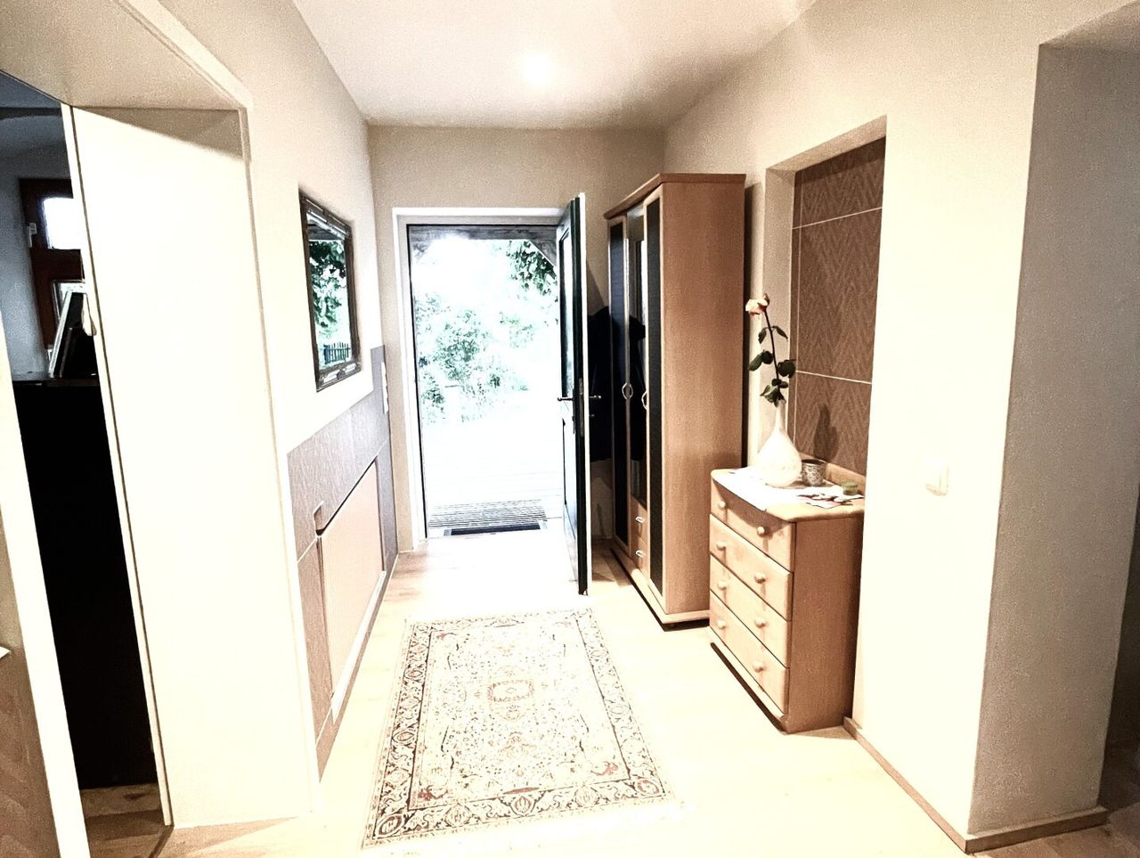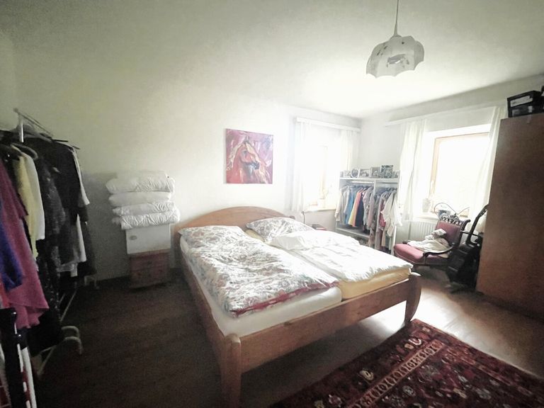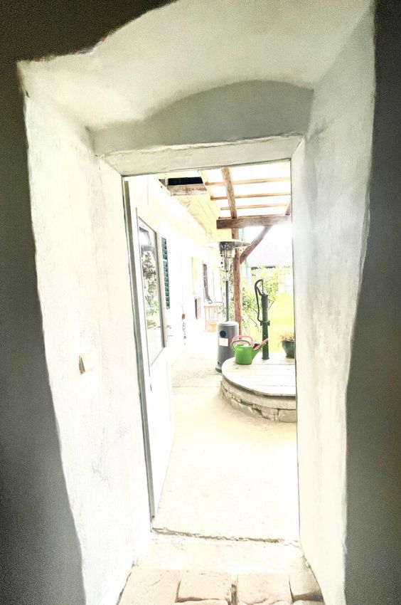 Durch den Vorgarten mit dem Küchengarten gelangt man von der überdachten Holzveranda in das Vorzimmer. Linker Hand liegt die Wohnküche mit der Frühstücksbar, dem Herd mit dem Ceranfeld, dem Backrohr, dem Geschirrspüler, der Spüle und dem Kühlschrank. Von der Küche aus gelangt man ins kleine Vorzimmer mit Zugang zum Hauswirtschaftsraum, dem großen sanierungsbedürftigen Gewölberaum, der derzeit als Lagerraum genützt wird und zum überdachten Sitzplatz im Innenhof führt. Zurück im Vorzimmer kann man das erste Badezimmer begehen, welches mit einem Fließenboden sowie einer Widerstand Fußbodenheizung ausgestattet ist und aus zwei Teilbereichen besteht: Der erste verfügt über das Waschbecken und das WC, der zweite Teil beinhaltet die Dusche und die Badewanne und hat direkten Zugang zum Innenhof. Rechts vom Vorzimmer aus liegt das erste Zimmer, das große Wohn-/Esszimmer mit den Zugängen zu weiteren drei Zimmern. Geradeaus gelangt man in das zweite Zimmer, das derzeit als Büro genützt wird. Links daneben befindet sich das dritte Zimmer, welches derzeit als erstes Schlafzimmer genützt wird. Auf der linken Seite des Wohn-/Esszimmers liegt das vierte Zimmer, welches als Wohnzimmer genützt wird. Von diesem aus kann man den Schrankraum, das fünfte Zimmer, welches als zweites Schlafzimmer genützt wird, sowie das kleine Vorzimmer mit Zugang zum kleinen Badezimmer, mit Waschbecken, Dusche, WC und Waschmaschine und dem Innenhof begehen.