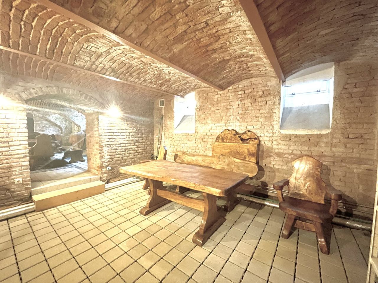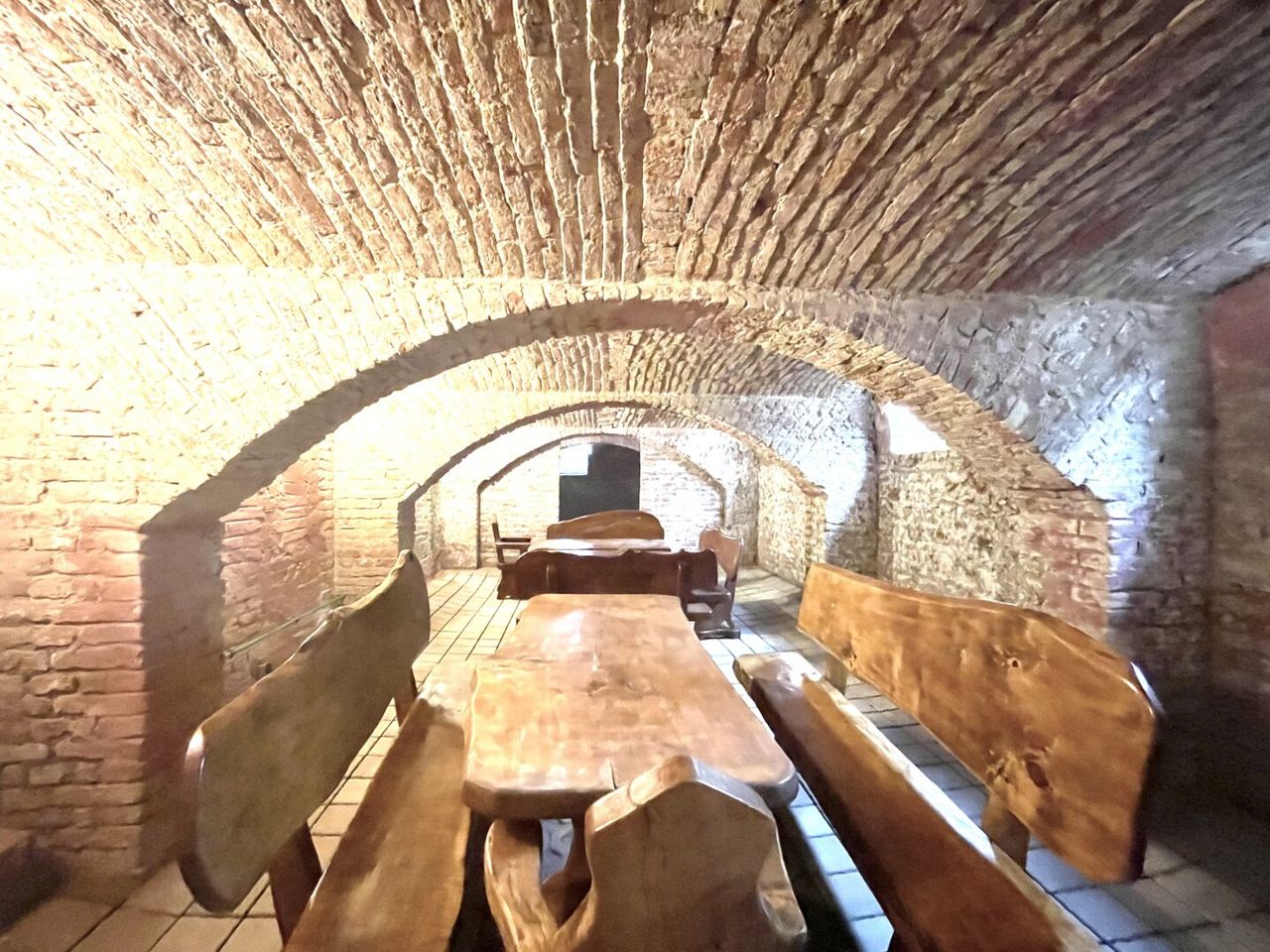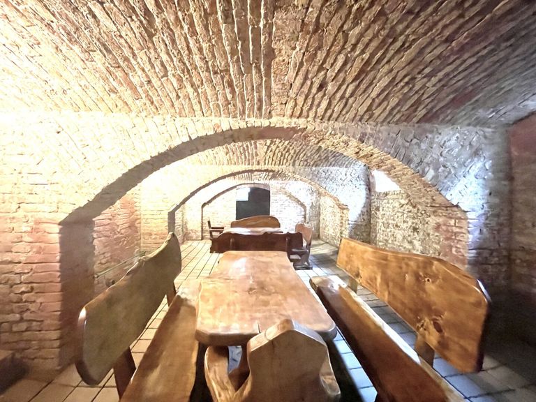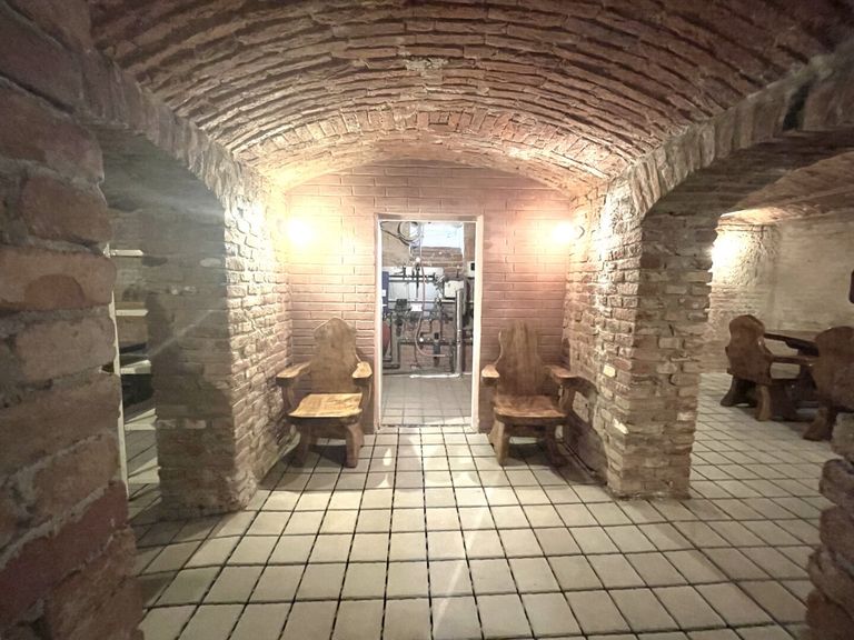 Der Keller mit der Ziegelgewölbedecke und den freiliegenden Ziegelwänden hat ein ganz besonderes Flair und kann ebenfalls als Lokal geführt werden. Konkret befinden sich hier im Eingangsbereich die Sanitärräumlichkeiten, geradeaus das Empfangszimmer, rechts davon liegt das erste Zimmer für ca. 10-20 Personen, links vom Empfangszimmer befindet sich das zweite Zimmer für ca. 10 Personen, daneben liegt das große Zimmer für ca. 20-30 Personen. Hinter dem Empfangszimmer befindet sich der Technikraum.