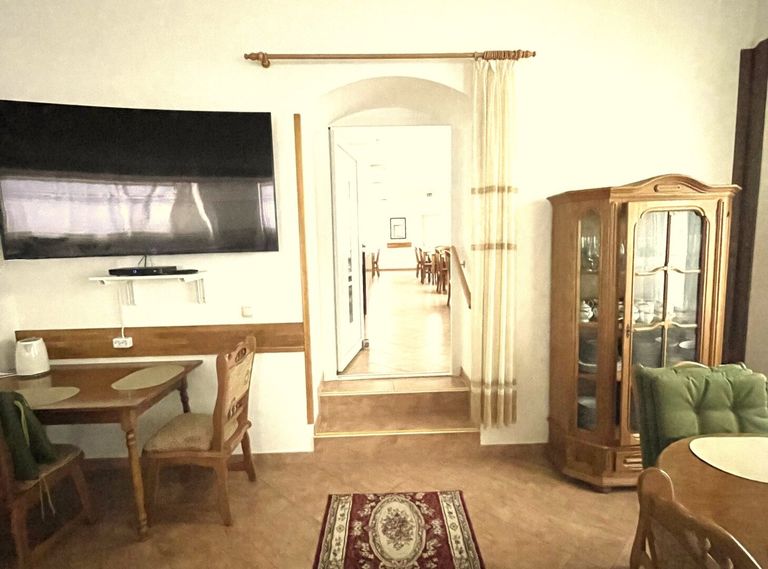 Über das gartenseitig begehbare Treppenhaus gelangt man in den ersten Stock, wo sich die drei bezugsfertigen Appartements, vollmöbliert, teilweise mit Antiquitäten, sowie eine Küche befinden.