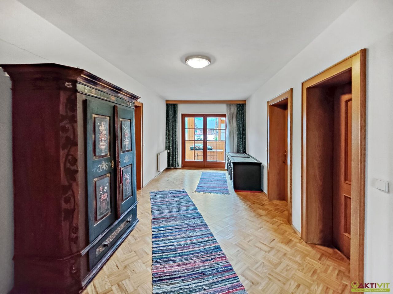 Von zwei Zimmern sowie vom Gang ist der Zugang zu einem großen umschließenden Balkon gegeben.