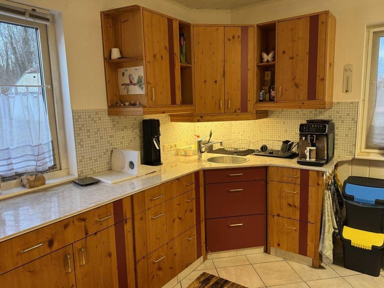 - eine große Küche mit gemütlicher Sitzecke