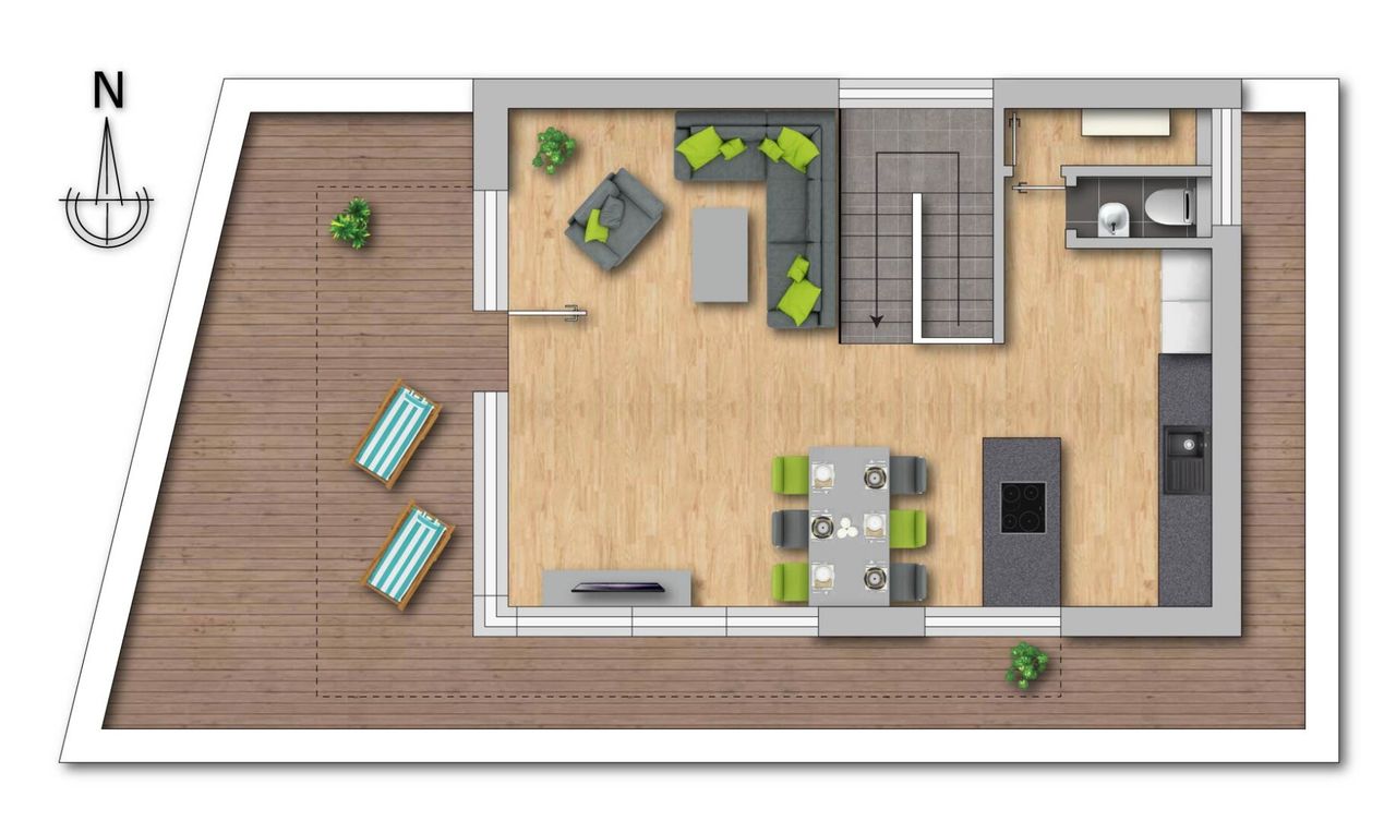 Das Herzstück des Hauses bildet das zweite Obergeschoss mit offenem Wohn- und Essbereich. Die moderne Küche mit Stein-Arbeitsplatte fügt sich harmonisch ein und bietet direkten Zugang zur beeindruckenden Dachterrasse mit 270°-Ausblick. Ein Abstellraum sowie eine Tagestoilette mit Fenster runden diese Ebene ab.