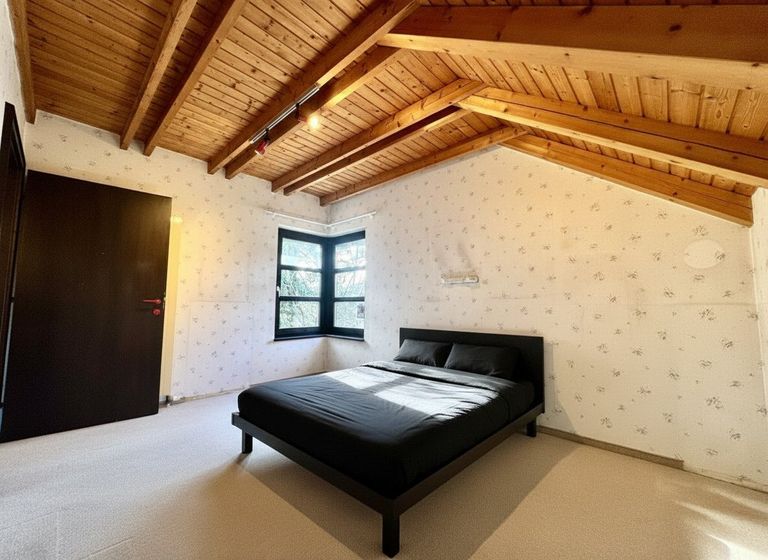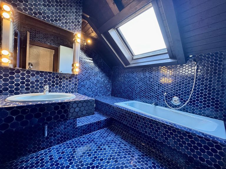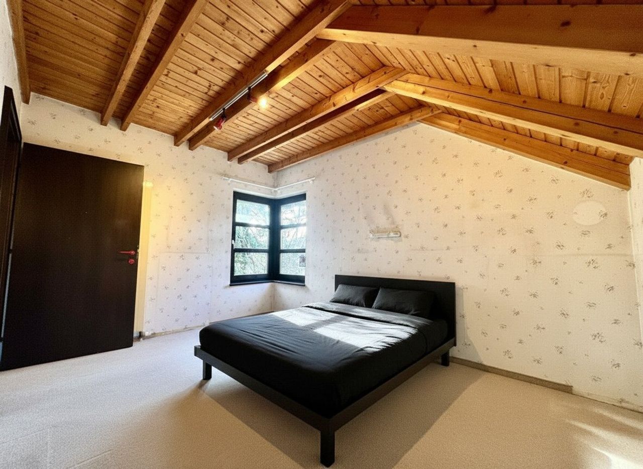 Im Obergeschoss öffnet sich die Galerie mit Zugang zu zwei Schlafzimmern. Eines davon verfügt über eine uneinsichtige Terrasse – ein Rückzugsort mit absoluter Privatsphäre – sowie großzügige Einbauschränke. Das Badezimmer ist mit Badewanne und Dusche ausgestattet und wird durch ein schräges Dachfenster mit natürlichem Licht durchflutet. Ein separates WC mit Fenster ergänzt diese Etage.