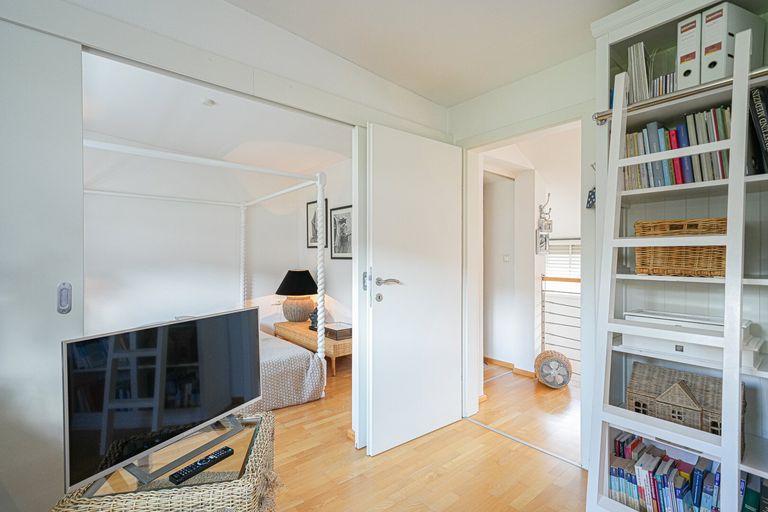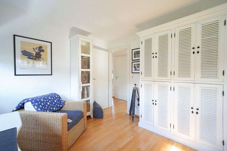 Über den Stiegenaufgang gelangt man in das Obergeschoss, wo sich die privaten Rückzugsräume des Hauses befinden. Auf dieser Etage stehen drei weitere Zimmer zur Verfügung, die flexibel als Schlaf-, Kinder-, Arbeits- oder Gästezimmer genutzt werden können. Alle Zimmer profitieren von einer großzügigen Belichtung und sind mit Rollläden ausgestattet.