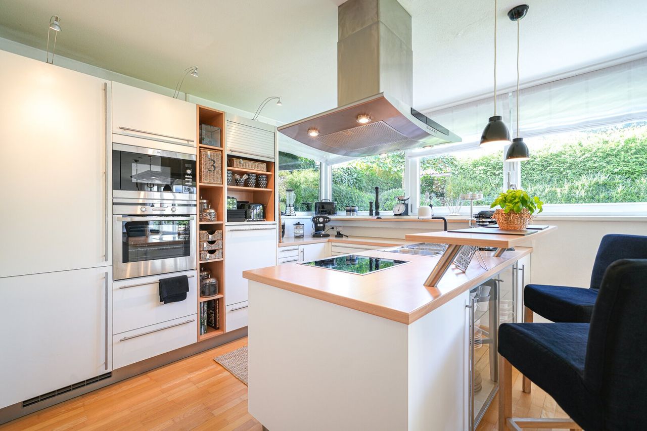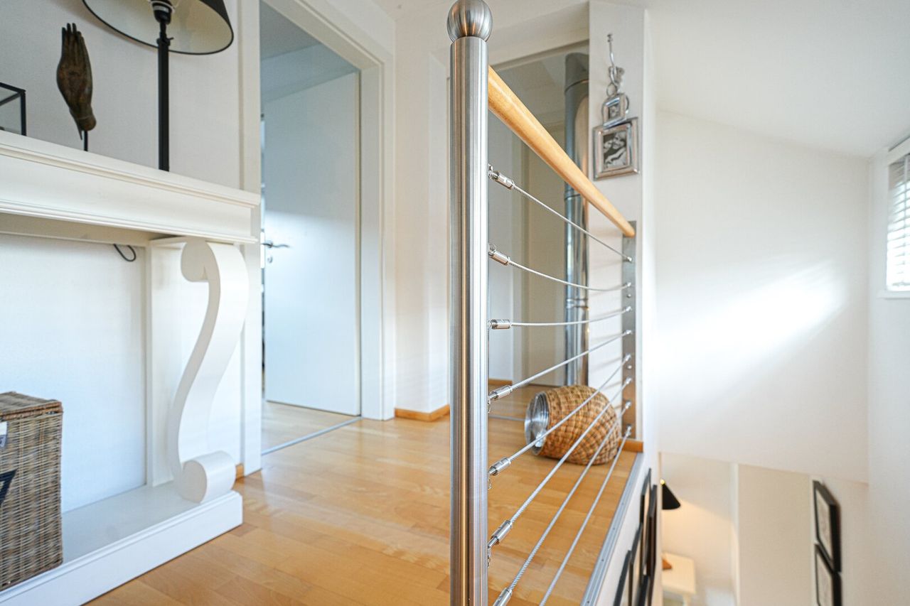 Die moderne Einbauküche mit hochwertigen Markenelektrogeräten fügt sich harmonisch in den offenen Wohn-Essbereich ein und bietet alles, was man für komfortables Kochen benötigt. Ergänzt wird die Küchenausstattung durch ein hochwertiges Abzugssystem, welches geruchsfreies Kochen auf höchstem Niveau ermöglicht. Ein separates Gäste-WC und ein funktionaler Abstellraum runden das Raumangebot auf dieser Etage sinnvoll ab.