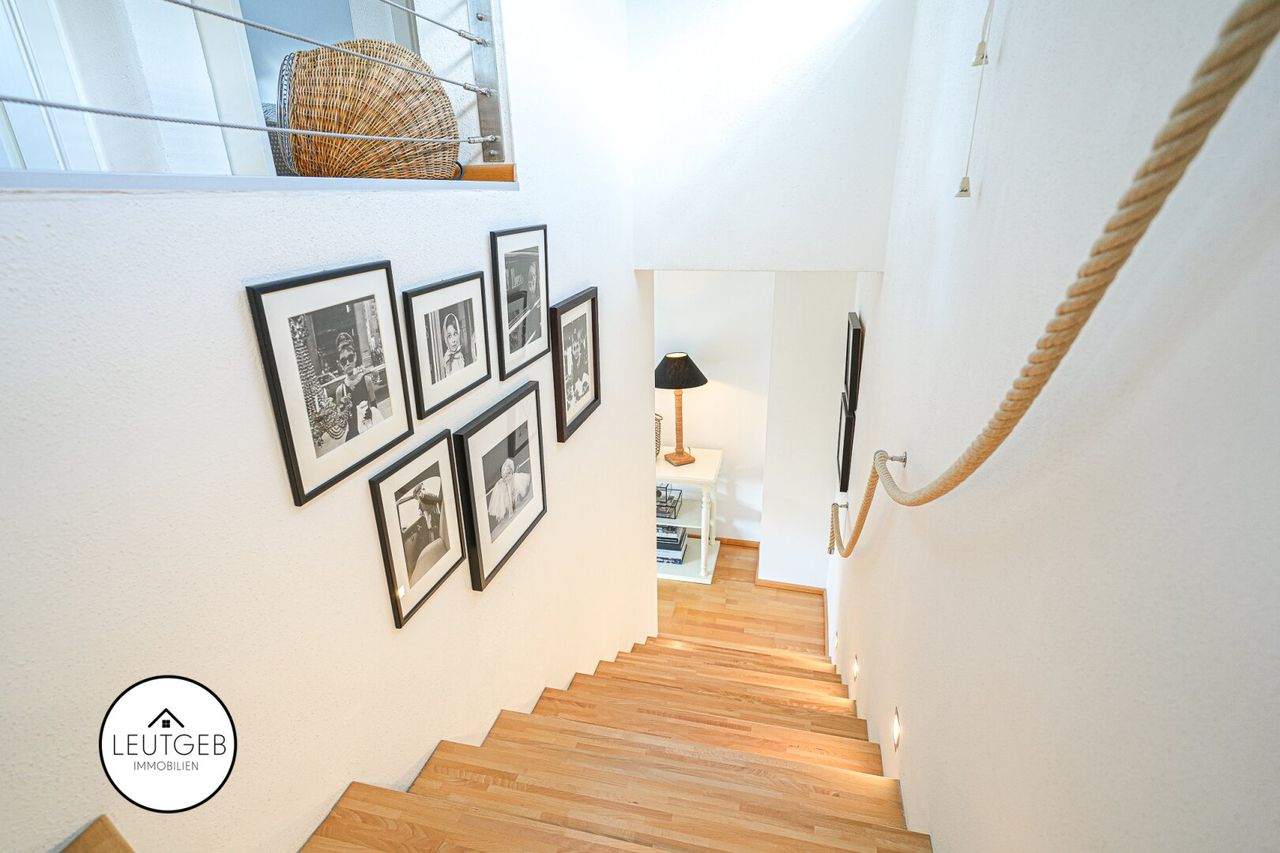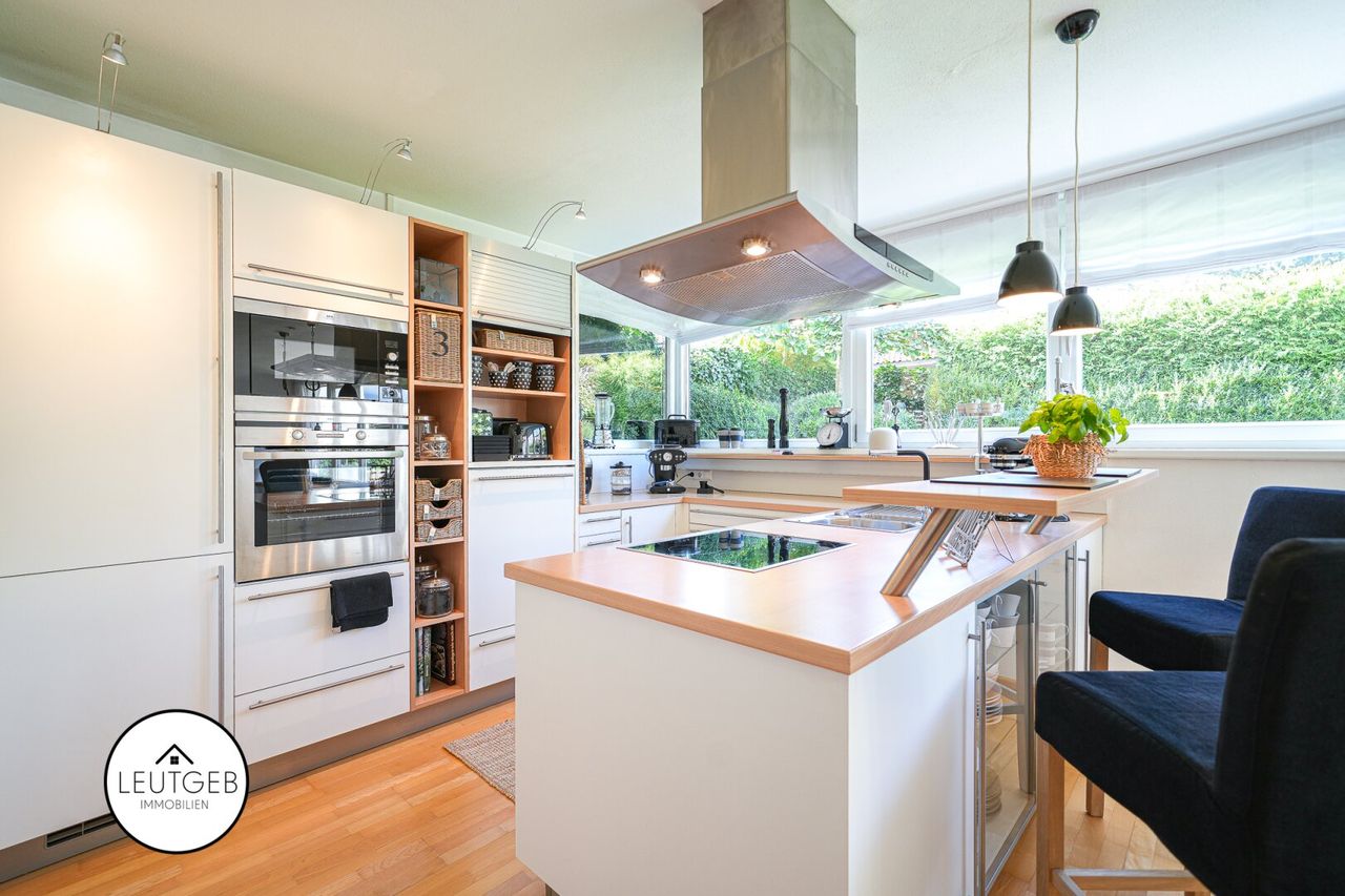 Die moderne Einbauküche mit hochwertigen Markenelektrogeräten fügt sich harmonisch in den offenen Wohn-Essbereich ein und bietet alles, was man für komfortables Kochen benötigt. Ergänzt wird die Küchenausstattung durch ein hochwertiges Abzugssystem, welches geruchsfreies Kochen auf höchstem Niveau ermöglicht. Ein separates Gäste-WC und ein funktionaler Abstellraum runden das Raumangebot auf dieser Etage sinnvoll ab.