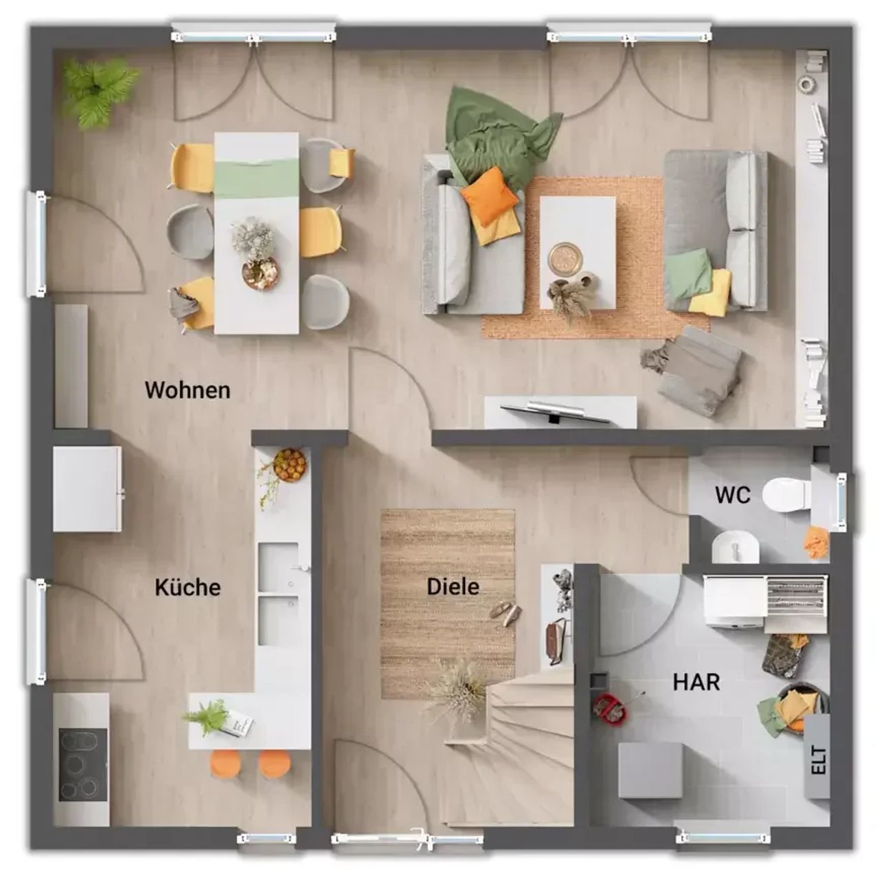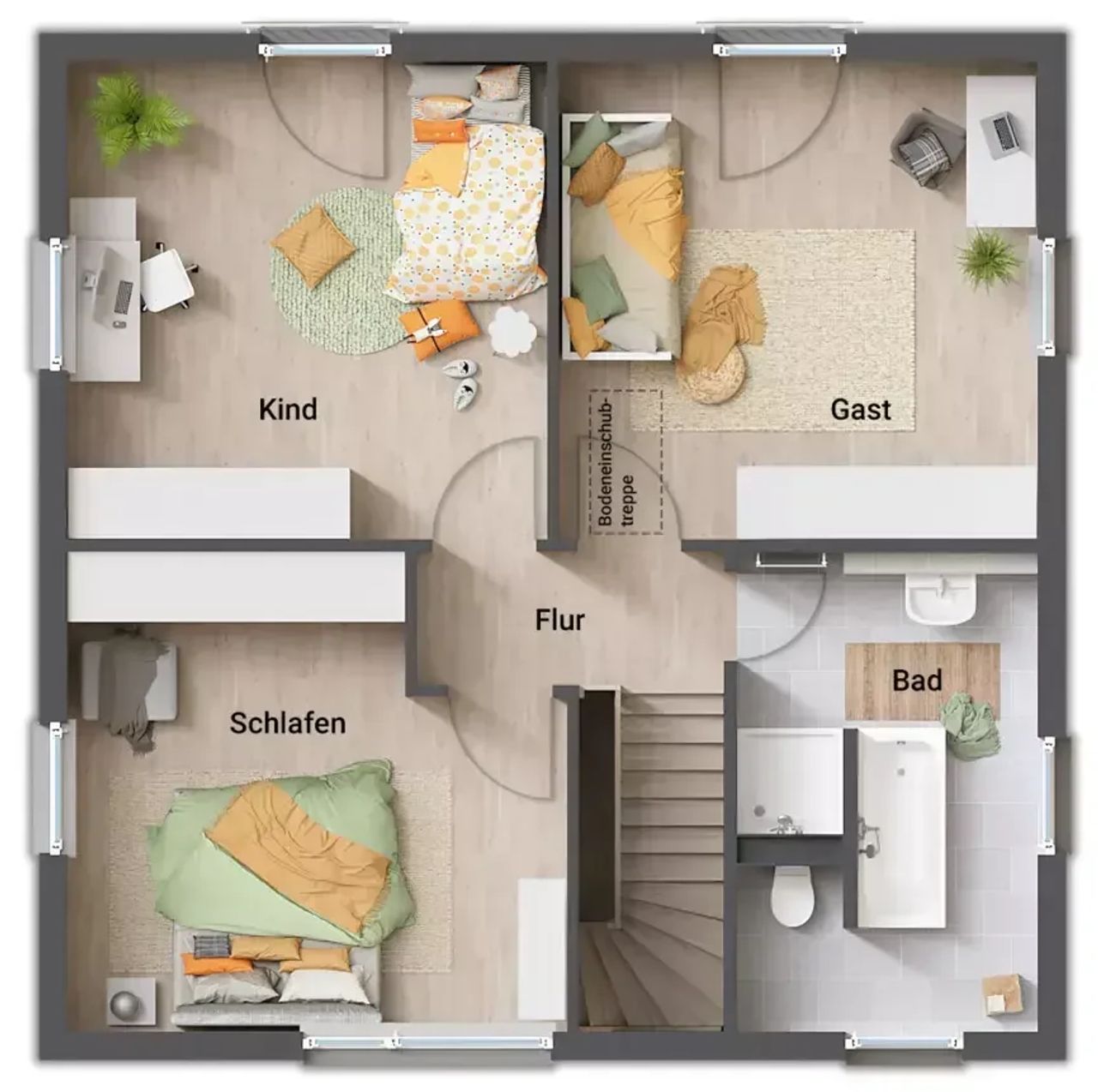- Zweigeschossig mit 4-5 Zimmern (individuell planbar)