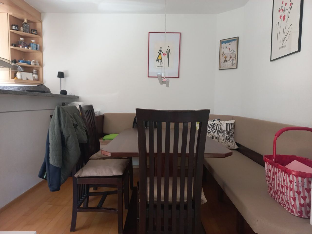 - Einbaumöbel (Schlafzimmer, Küche, Garderobe, Badezimmer) und die Essecke sind vom Tischler gefertigt