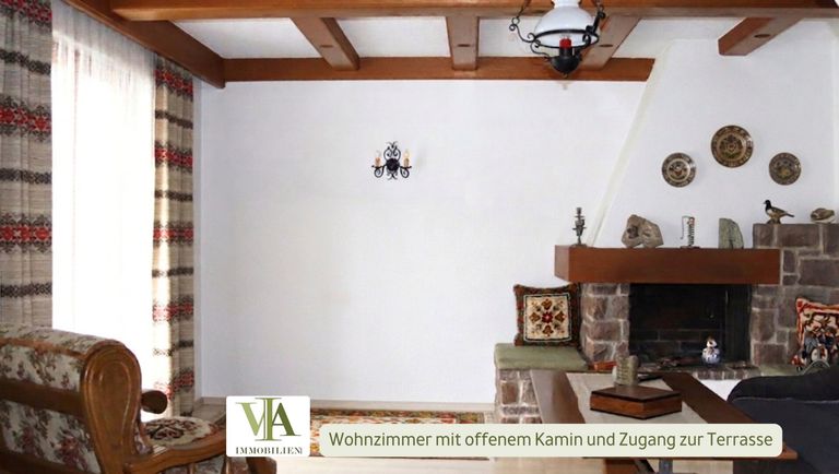 Hier befinden sich Wohn- und Essbereich, Küche sowie ein Badezimmer mit der Dusche und Fenster. Vom Wohnzimmer aus gelangt man auf die überdachte Terrasse, die zum Verweilen und Genießen der Natur einlädt. Das Wohnzimmer verfügt über einen offenen Kamin, während im Esszimmer und in der Küche ein Kachelofen für zusätzliche gemütliche Wärme sorgt. Ein Raum von ca. 24 m² im hinteren Teil des Hauses bietet zusätzlichen praktischen Stauraum für Geräte oder sonstige Lagerung.