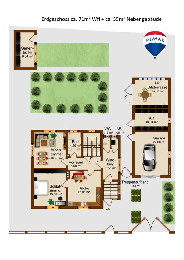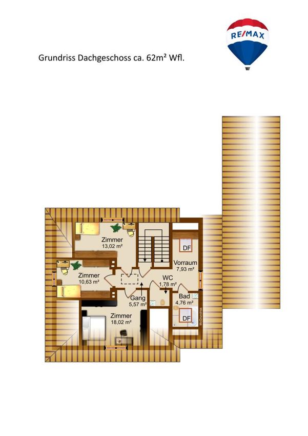 Vorraum WC Abstellraum 1 Schlafzimmer Wohnküche Wohnzimmer BadezimmerIm Obergeschoss ca. 62 m² Wfl.