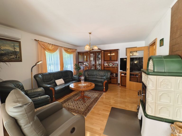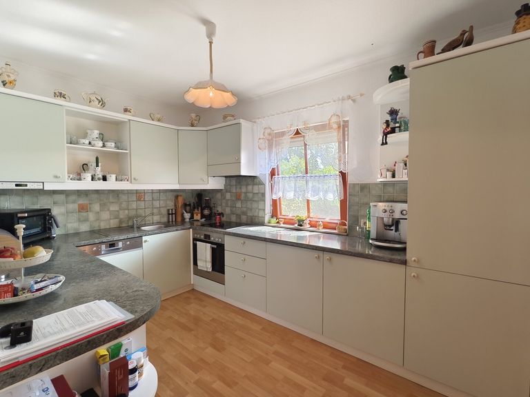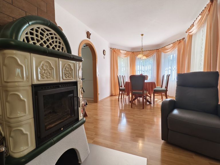 Im Inneren des Hauses empfängt Sie eine großzügige Diele mit Windfang. Das Herzstück bildet der lichtdurchflutete Wohnraum mit Essbereich im gemütlichen Erker sowie ein stilvoller Loungebereich mit Kaminofen – perfekt für behagliche Abende mit Blick ins Grüne. Die Küche mit Speis fügt sich funktional und einladend in das Gesamtkonzept ein.