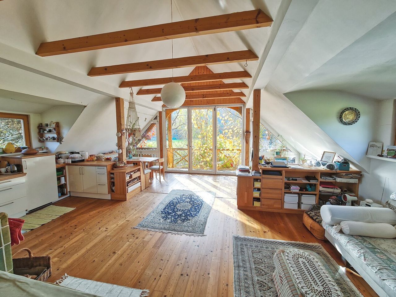 Highlight des Hauses ist sicher der nach oben hin offene Wohn-/Eß-/Küchenbereich im Ober- bzw. Dachgeschoß mit seinen großen Fensterflächen (Falttüren lassen sich ganz öffnen) und dem Holzdielenboden. Es gibt wohl kaum jemanden, der sich hier nicht wohl fühlt! Die Gartenterrasse nach Süden hin ist zur Gänze überdacht. Ein eigener Brunnen für Brauchwasser und eine Garage mit zusätzlichem Stauraum stehen zur Verfügung. Das Haus ist teilunterkellert.