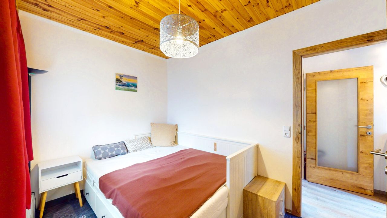 Der offene Wohn- und Essbereich ist lichtdurchflutet und führt direkt in die Küche, auf die Terrasse und in das zweite Schlafzimmer. Die gemütliche, rustikale Essecke, ein zeitloses Sofa und ein Specksteinofen schaffen eine behagliche Atmosphäre; bodentiefe Fenster ermöglichen den direkten Blick und Zutritt in den Garten. Die Küche ist vollständig ausgestattet und in ansprechender Holzoptik ausgeführt – ideal für private Nutzung oder Feriengäste. Alle Türen im Erdgeschoss sind in hochwertiger Holzoptik mit Edelstahl-Türgriffen; der gesamte Fußbodenbereich ist mit einem edlen Holzbelag versehen, wodurch ein stimmiges Gesamtbild entsteht.