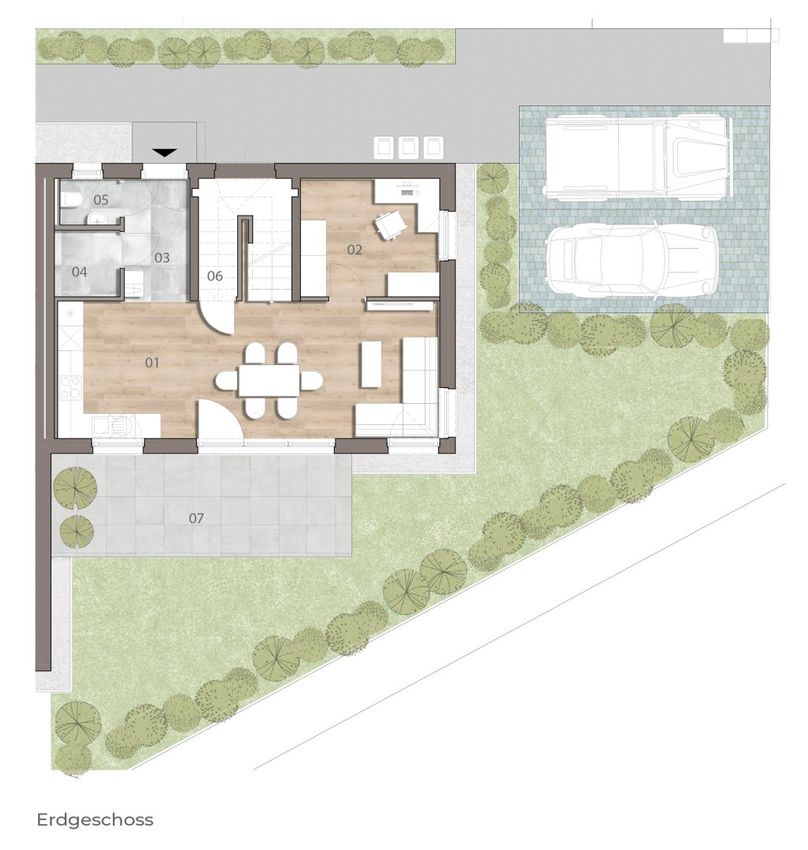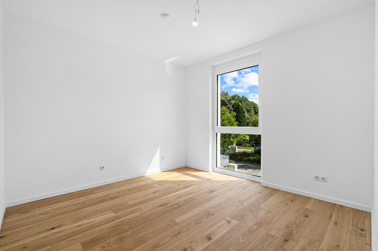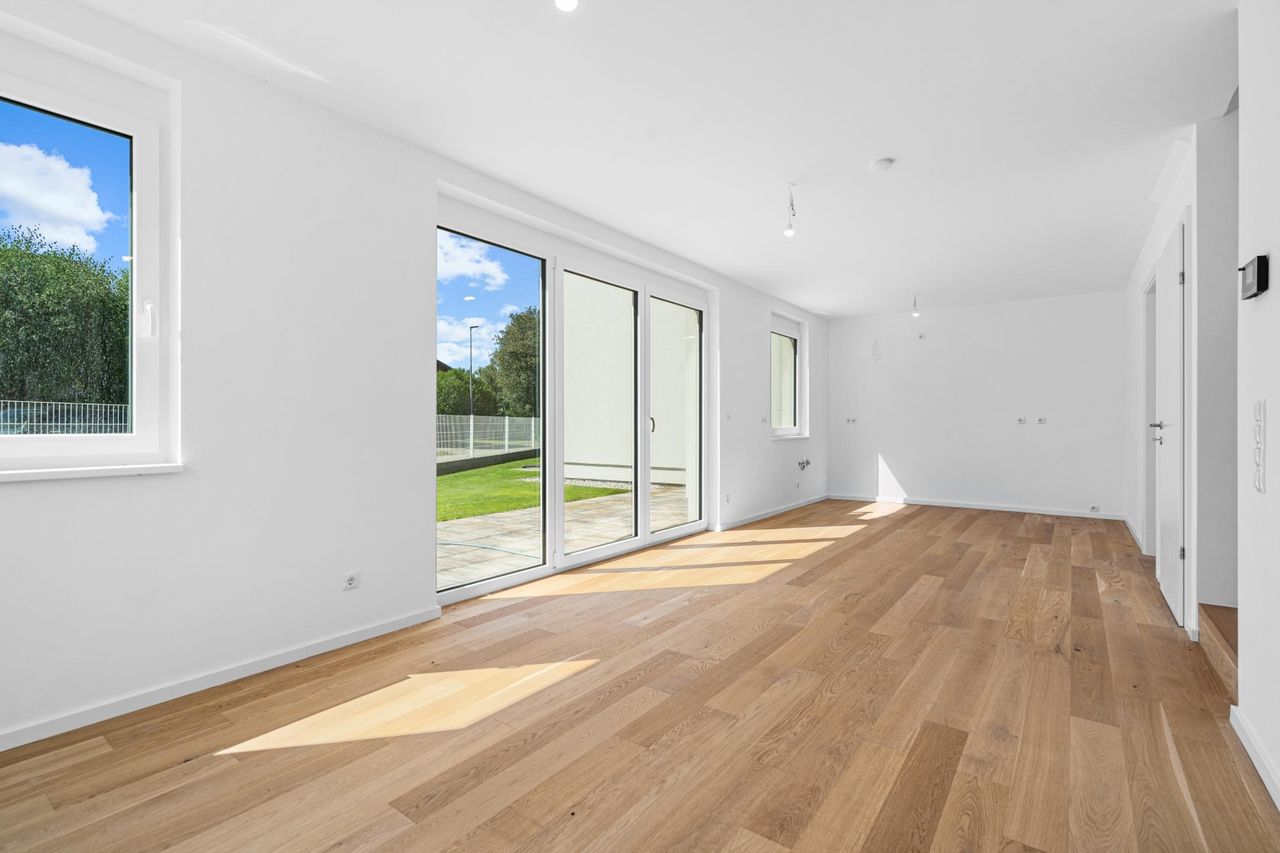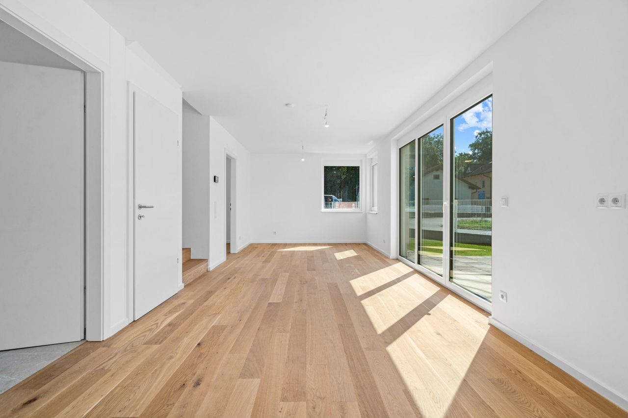 Bodentiefe Fenster öffnen den Blick ins Grüne, während Terrassen und Eigengärten private Oasen im Freien schaffen. Hier verbinden sich Natur und Architektur zu einem harmonischen Lebensraum.