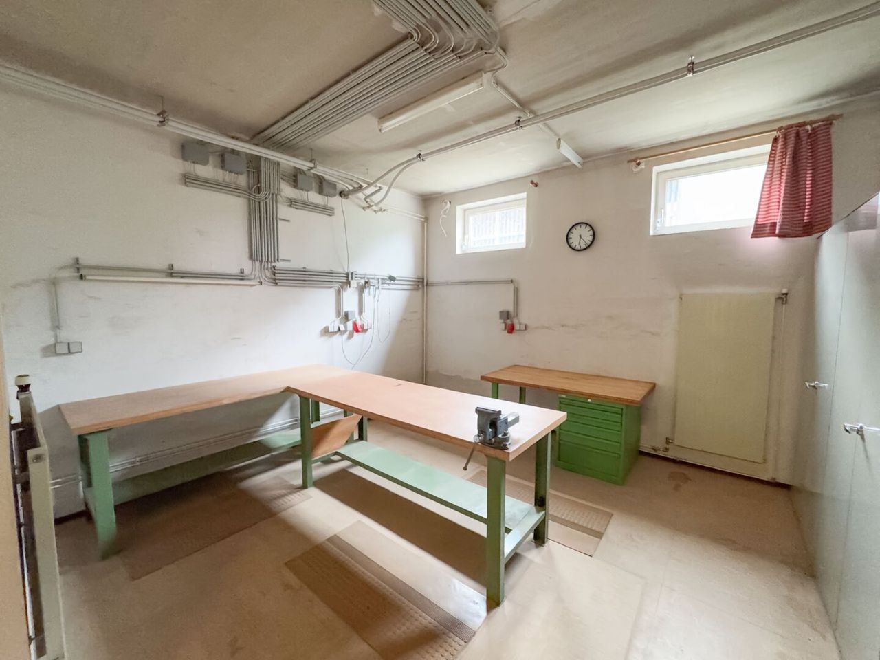 Keller (ca. 160 m², 3 m Höhe): mehrere Kellerräume, Bad/WC, Heizraum, Werkstatt mit massiven Werkbänken, direkte Garagenanbindung. Ideal auch für berufliche Zwecke, Atelier, Studio oder Hobbys.