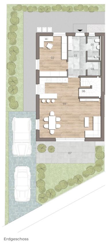 Bodentiefe Fenster öffnen den Blick ins Grüne, während Terrassen und Eigengärten private Oasen im Freien schaffen. Hier verbinden sich Natur und Architektur zu einem harmonischen Lebensraum.