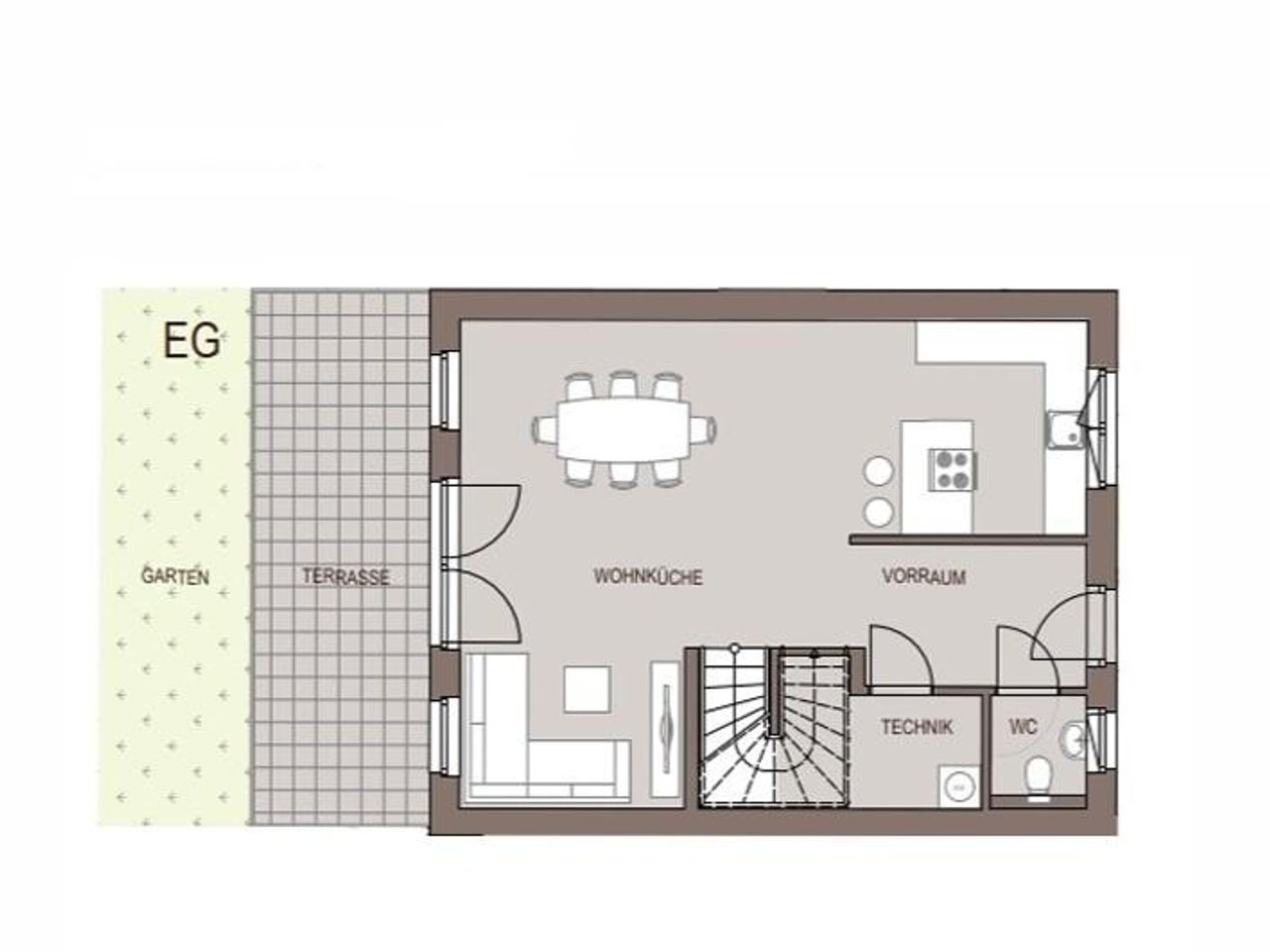 Erdgeschoss: Wohnküche (ca. 42 m²) mit Ausgang zur Terrasse, Vorraum, Abstellraum, Technikraum, WC