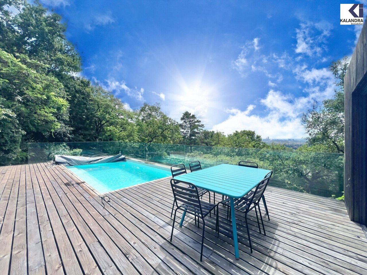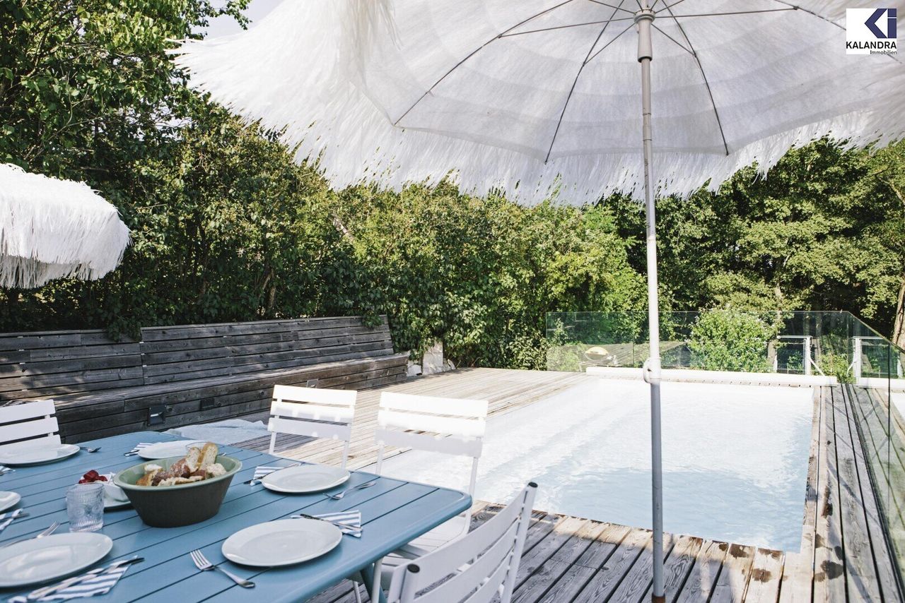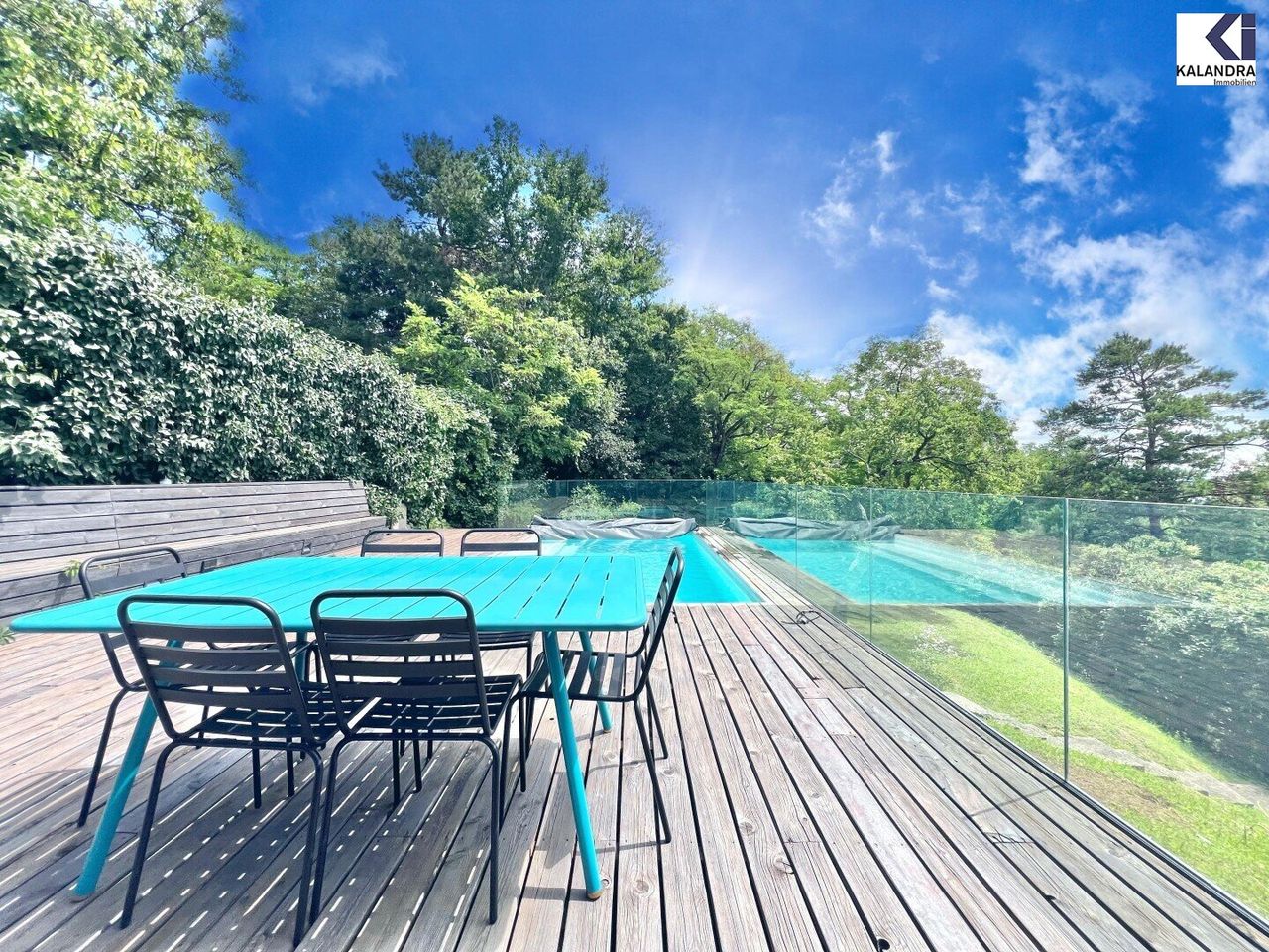 Über eine große Glasschiebetüre Ausgang auf eine südseitige, ca. 83m² große Terrasse mit Outdoor-Essbereich und integriertem Infinity-Pool.