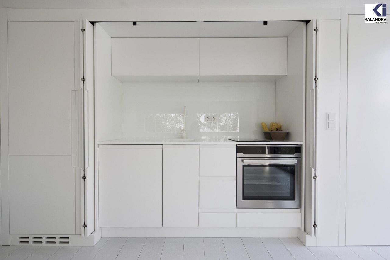 Das ca. 22m² große Wohn-/ Schlafzimmer mit in einem Wandverbau integrierter Küche, ist direkt über die Terrasse zugänglich, ein Duschbad (ca. 7m²), separates WC,