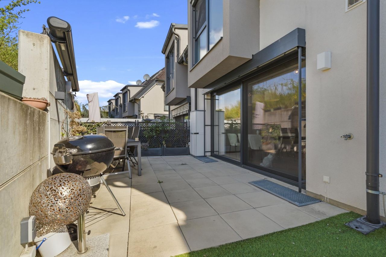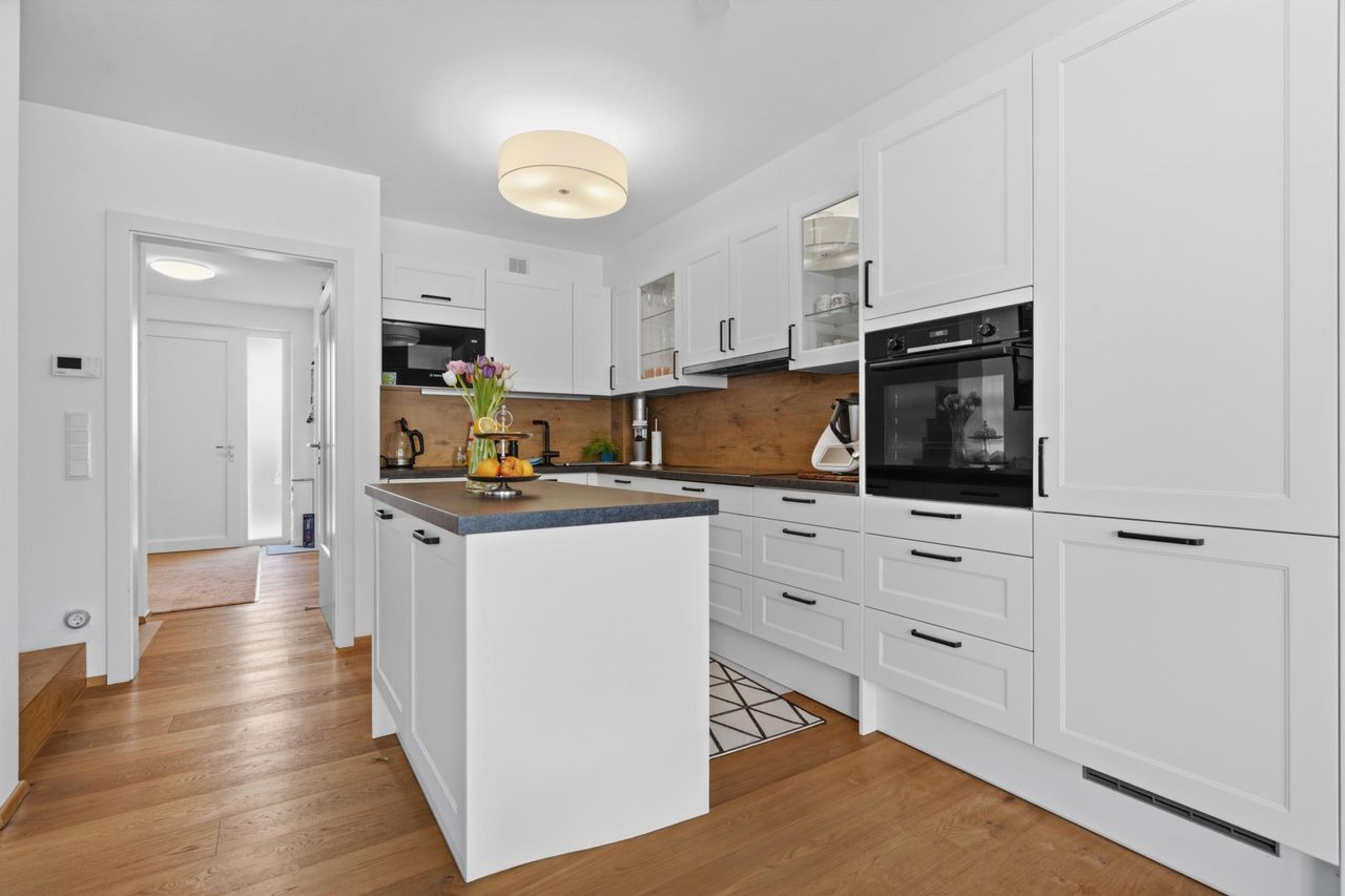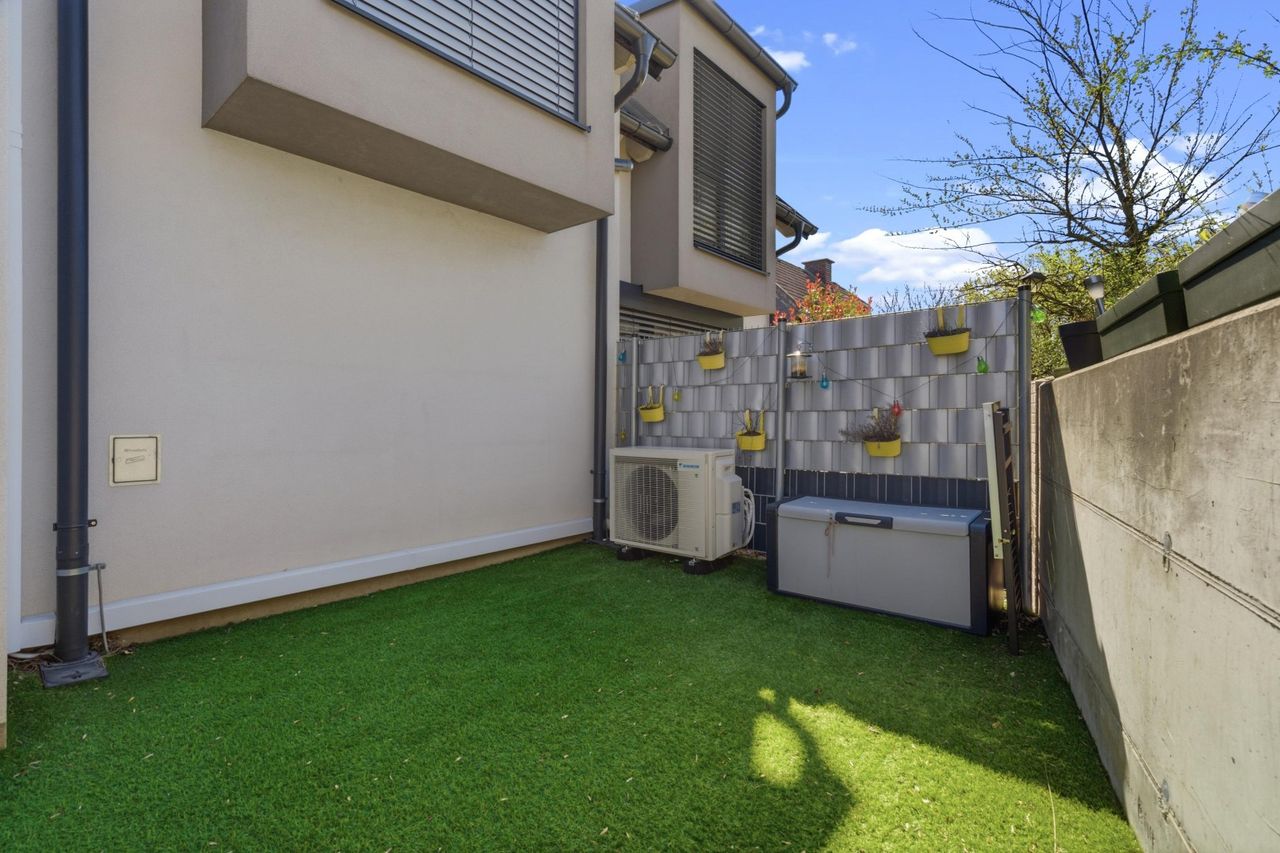 Das Herzstück des Hauses ist der großzügige Wohnbereich mit moderner Küche und Kochinsel. Große Fensterflächen sorgen für viel Tageslicht und schaffen eine direkte Verbindung zum Garten. Der Außenbereich ist kompakt, pflegeleicht und ideal für Familien – perfekt für spielende Kinder oder entspannte Stunden im Freien.