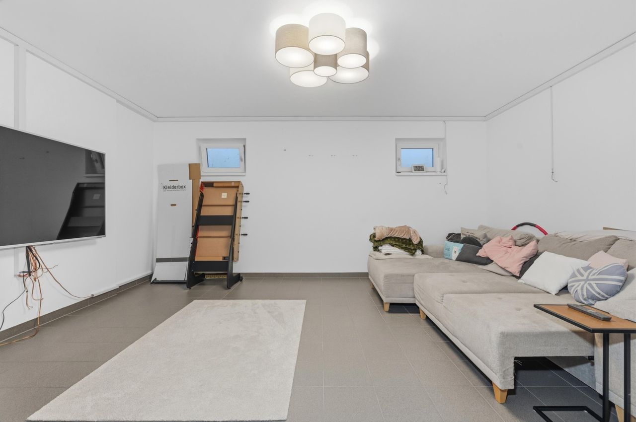 Das Badezimmer präsentiert sich hell und freundlich und bietet mit Dusche und Badewanne den passenden Rahmen für Komfort und Wohlbefinden – ideal für den Alltag wie auch für entspannte Momente. Ergänzt wird das Angebot durch einen funktionellen Kellerbereich, der weit über klassischen Stauraum hinausgeht. Ob Fitnessraum, Heimkino oder persönlicher Rückzugsort – hier entsteht zusätzlicher Platz, der den Alltag sinnvoll erweitert.
