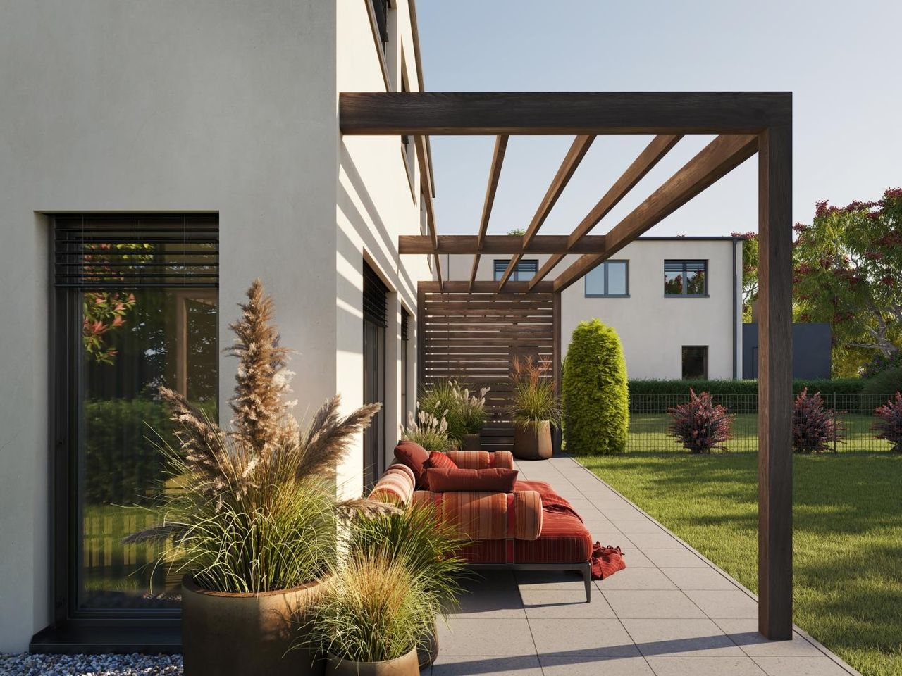 Die modernen Häuser in ökologischer, massiver Holzbauweise bieten einen großzügigen, lichtdurchfluteten Wohnbereich mit bodentiefen Fenstern und Austritt auf die Terrasse in südlicher Ausrichtung.
