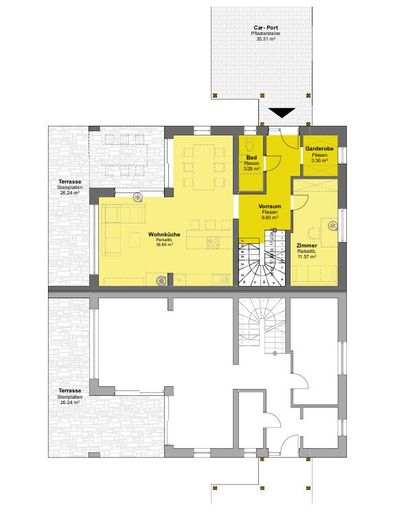 Für Ihre Fahrzeuge stehen zwei Stellplätze zur Verfügung, die Ihnen das Parken erleichtern. Die praktische Anordnung der Räume und die hochwertige Ausstattung garantieren Ihnen ein komfortables Wohnerlebnis, das keine Kompromisse eingeht.