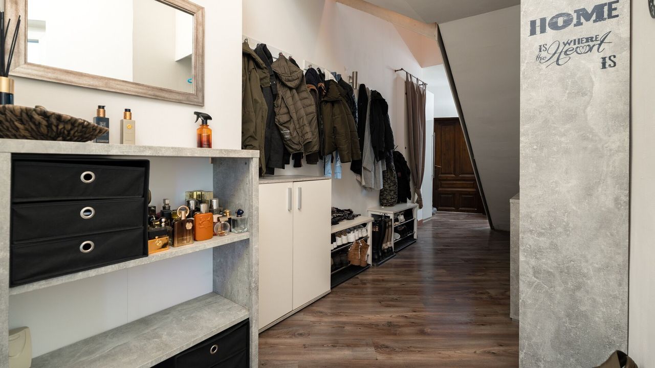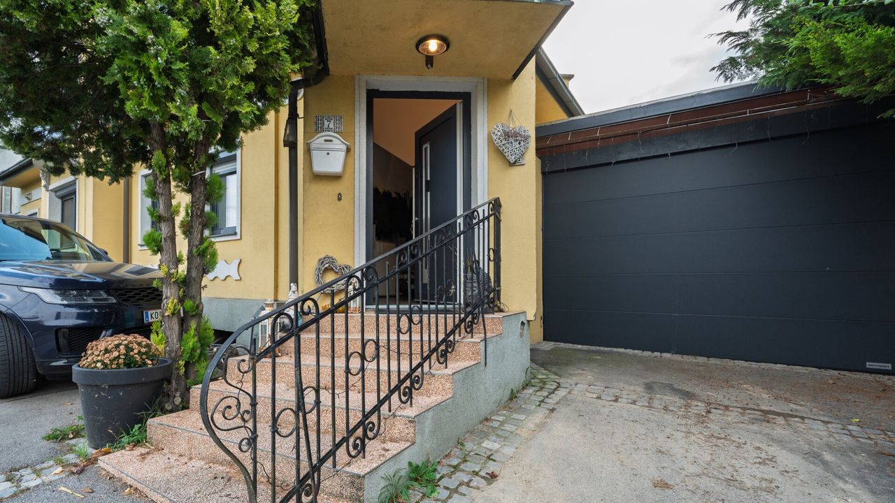 Der Zugang zum Haus erfolgt über einige Stufen in einen zentralen Vorraum, der sowohl ins Erd- als auch ins Obergeschoss führt – die beiden Einheiten sind somit separat nutzbar.