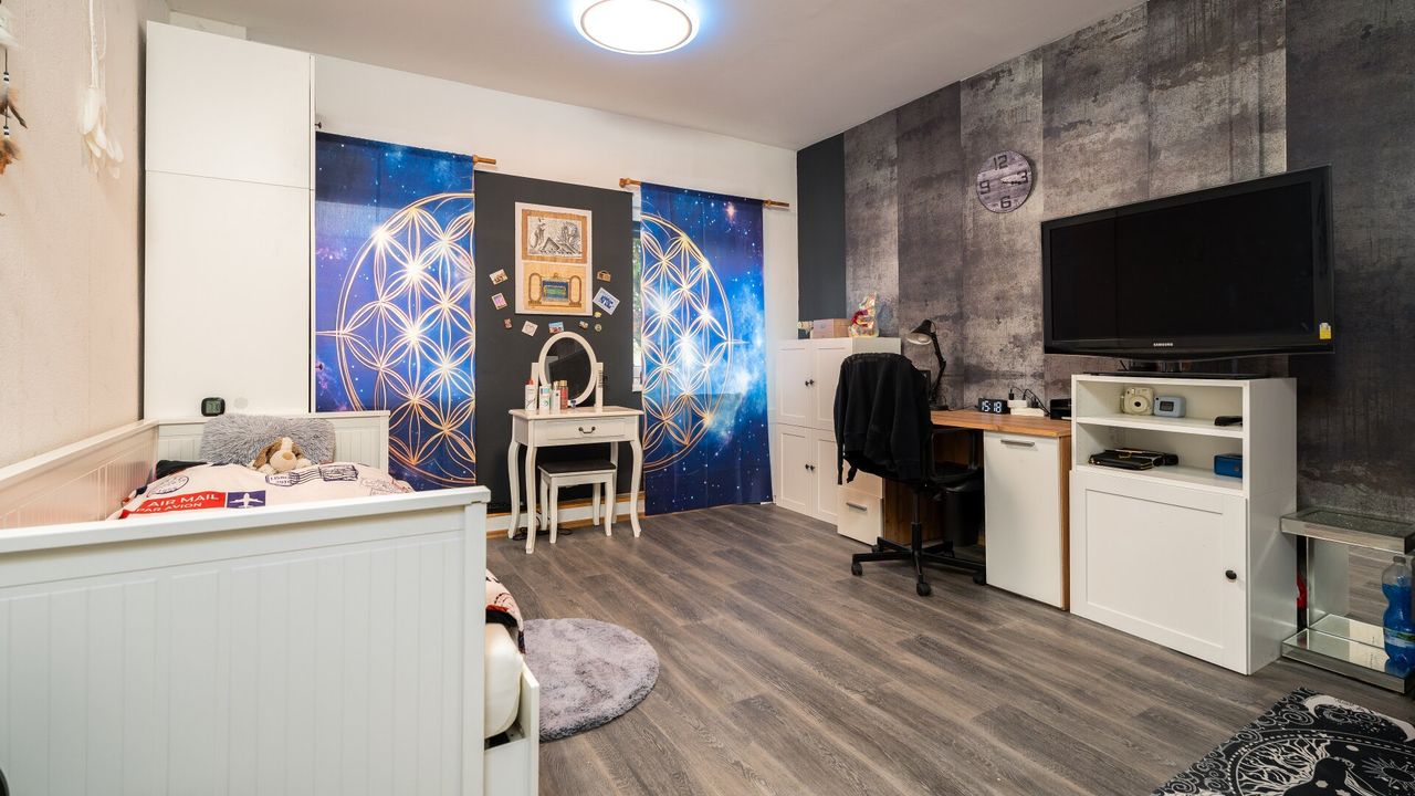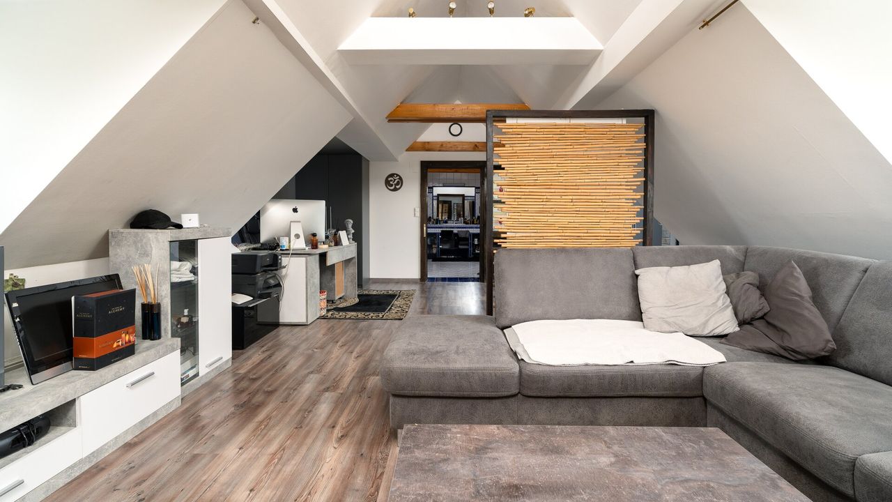 Über eine geschwungene Treppe erreicht man das Obergeschoss. Hier befindet sich ein heller Wohn-Essbereich (aktuell als Büro genutzt, Küchenanschlüsse vorhanden), ein großzügiges Badezimmer mit Dusche, WC und Badewanne, ein Schrankraum, ein breiter Gang sowie ein geräumiges Schlafzimmer.