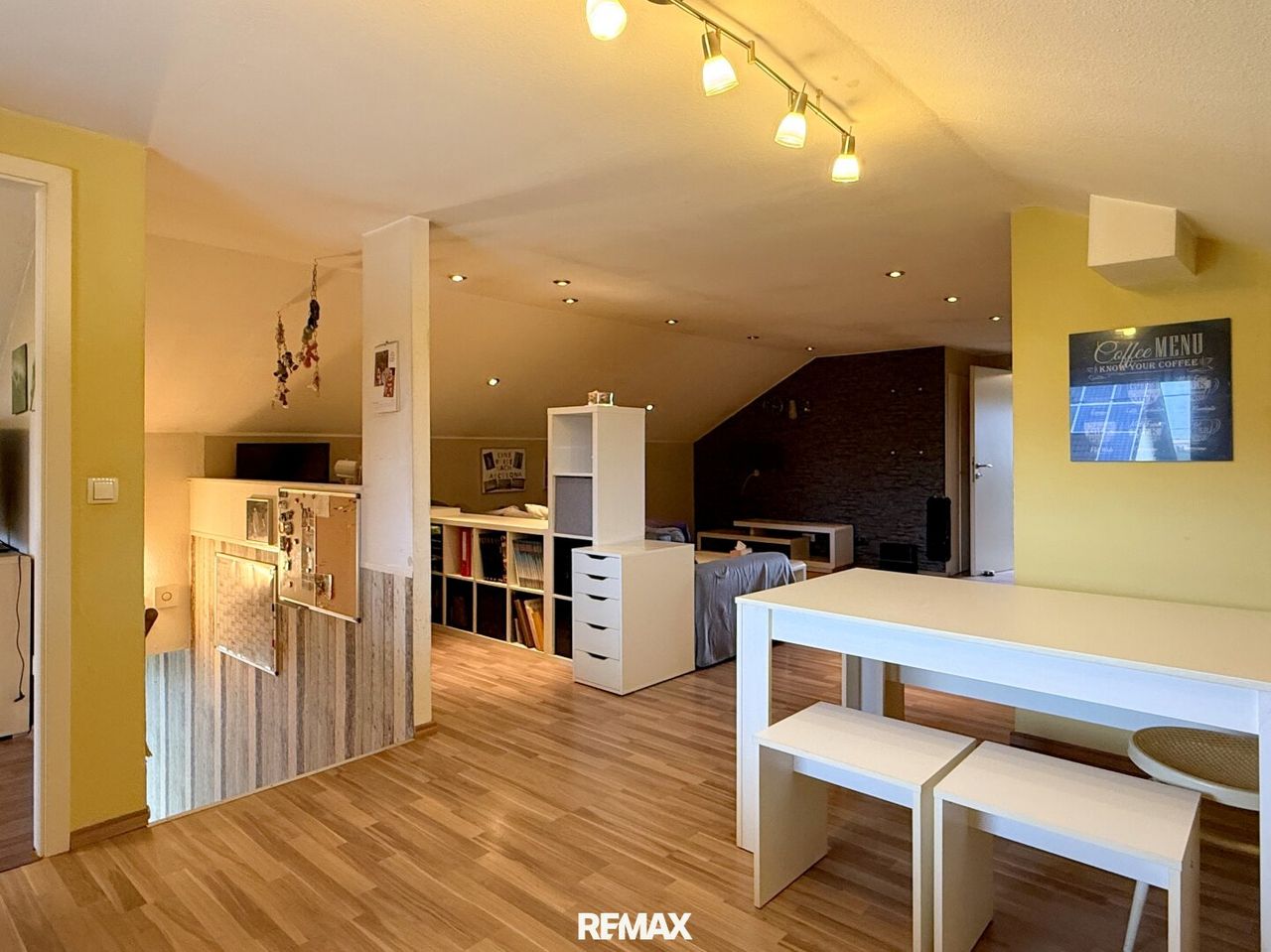 Von hier führt eine Treppe ins ausgebaute Dachgeschoss – und das hat es wirklich in sich: Dachschrägen, offene Küche, ein richtig chilliger Wohnbereich, zwei Zimmer, Abstellräume und ein Bad mit Wanne. Ob Teenie-Königreich, Rückzugsort für Gäste oder einfach „Familienlevel XXL“ – hier passt alles rein. Macht zusammen fast 200 m² Wohnfläche.
