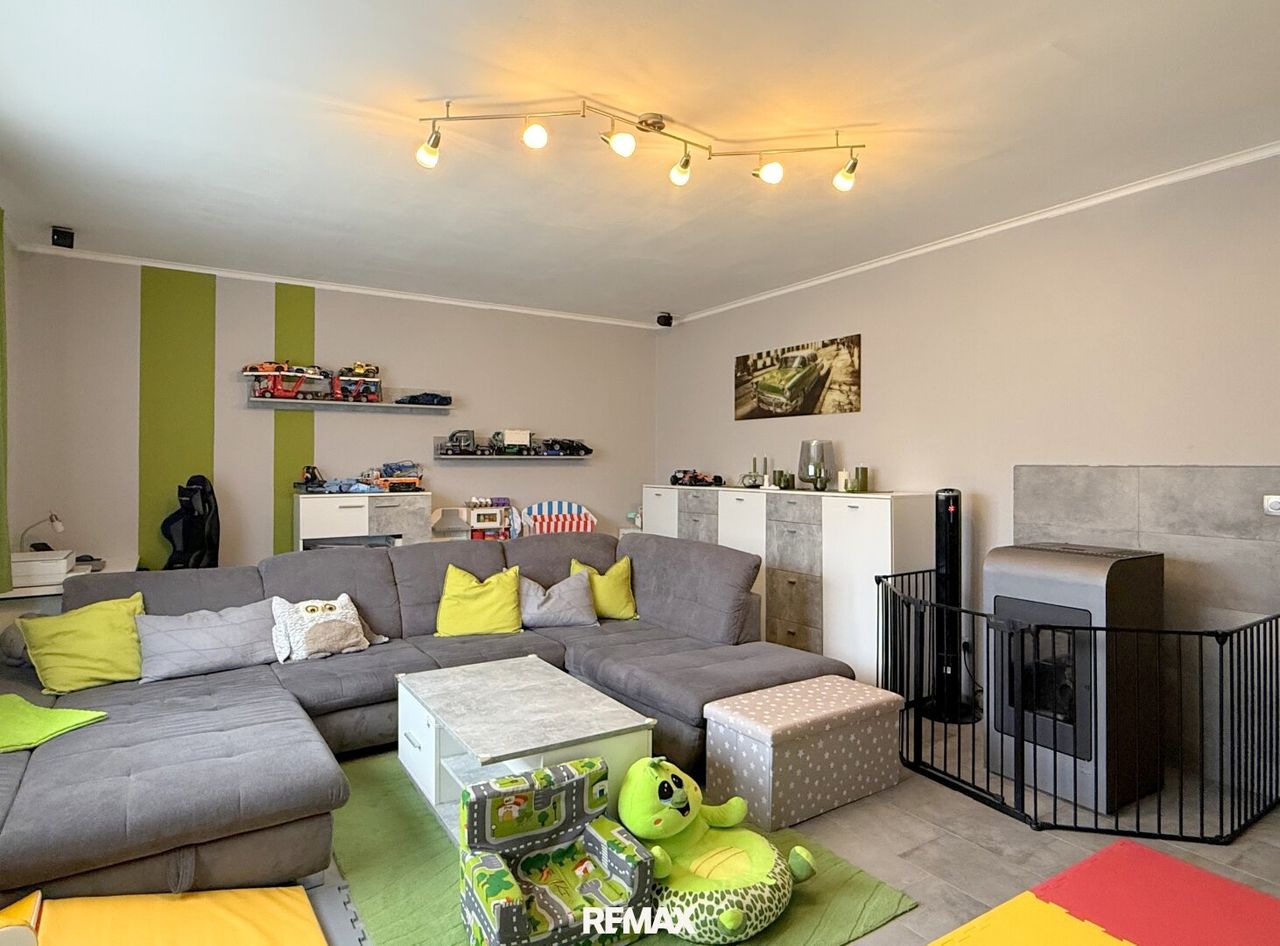 Das südseitige Wohnzimmer ist hell, gemütlich und von angenehmer Größe. Ein Pelletsofen sorgt für knisternde Abende mit Kakao und Popcorn. Durch die Tür geht’s hinaus auf die überdachte Terrasse, wo der Griller schon wartet. Von dort ein paar Stufen weiter direkt in den Garten – die kleinen Entdecker nehmen lieber gleich die Rutsche.