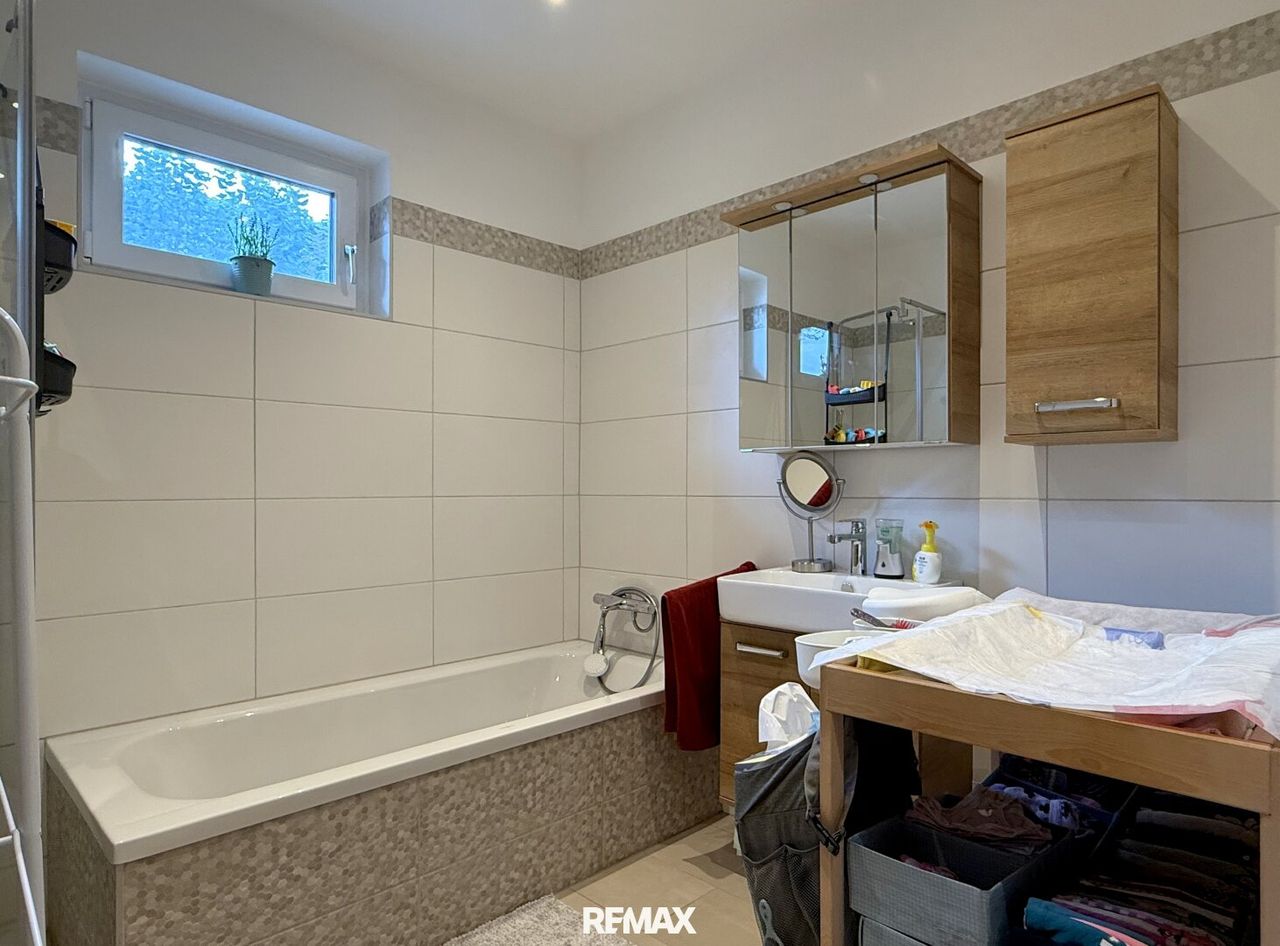 Weiter geht’s ins Bad. Badewanne? Check! Hier verwandeln sich Kinder in kleine Kapitäne, Piraten oder Meerjungfrauen. Wer lieber auf „schnell und praktisch“ setzt, freut sich über die zusätzliche Dusche. Und weil man ja irgendwann auch wieder Ruhe haben will, ist das WC separat.