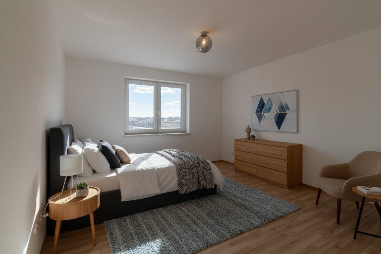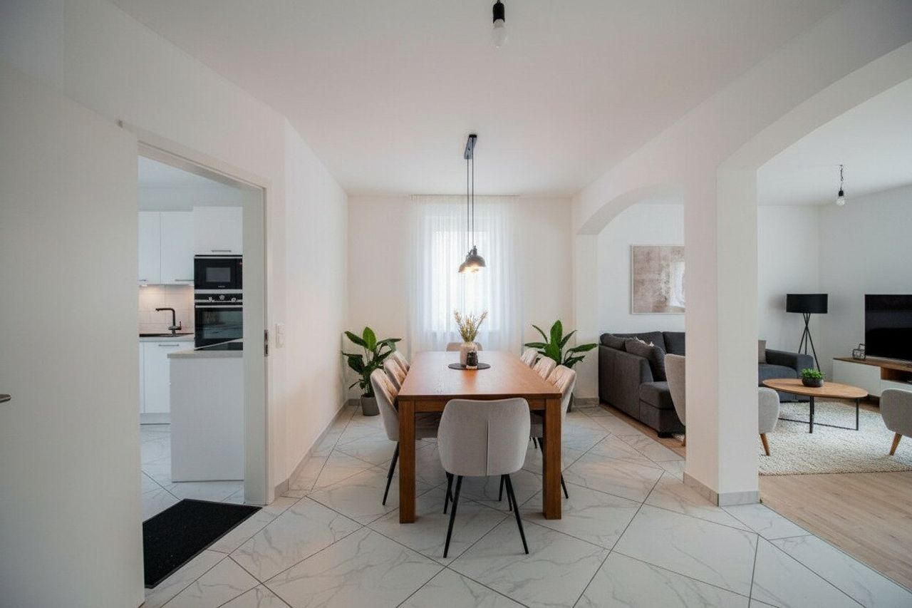 „Die dargestellten Möbel und Einrichtungsgegenstände dienen der besseren räumlichen Vorstellung und wurden mittels KI visualisiert. Sie sind nicht Bestandteil der tatsächlichen Ausstattung der Immobilie.“