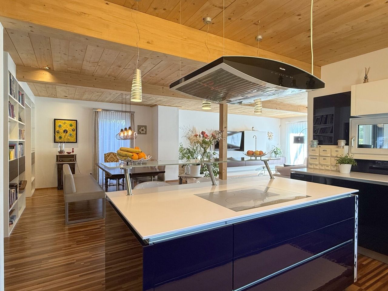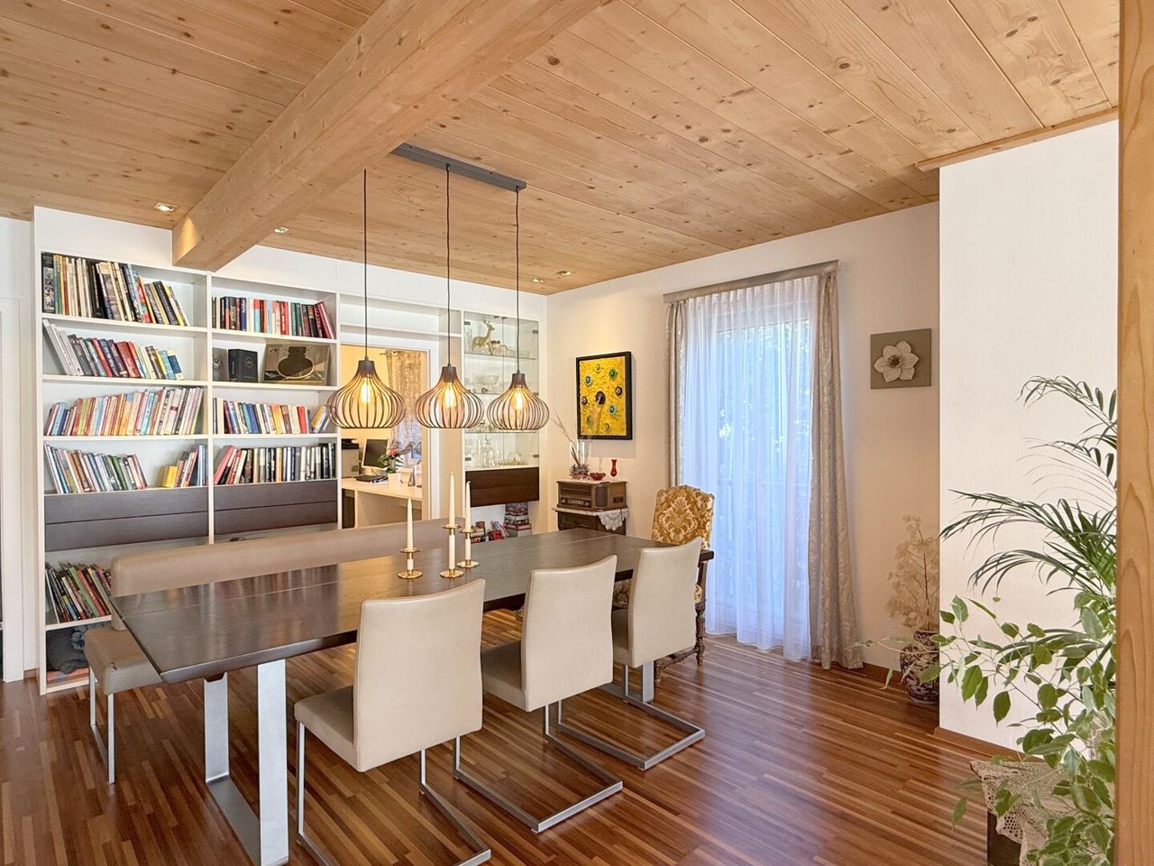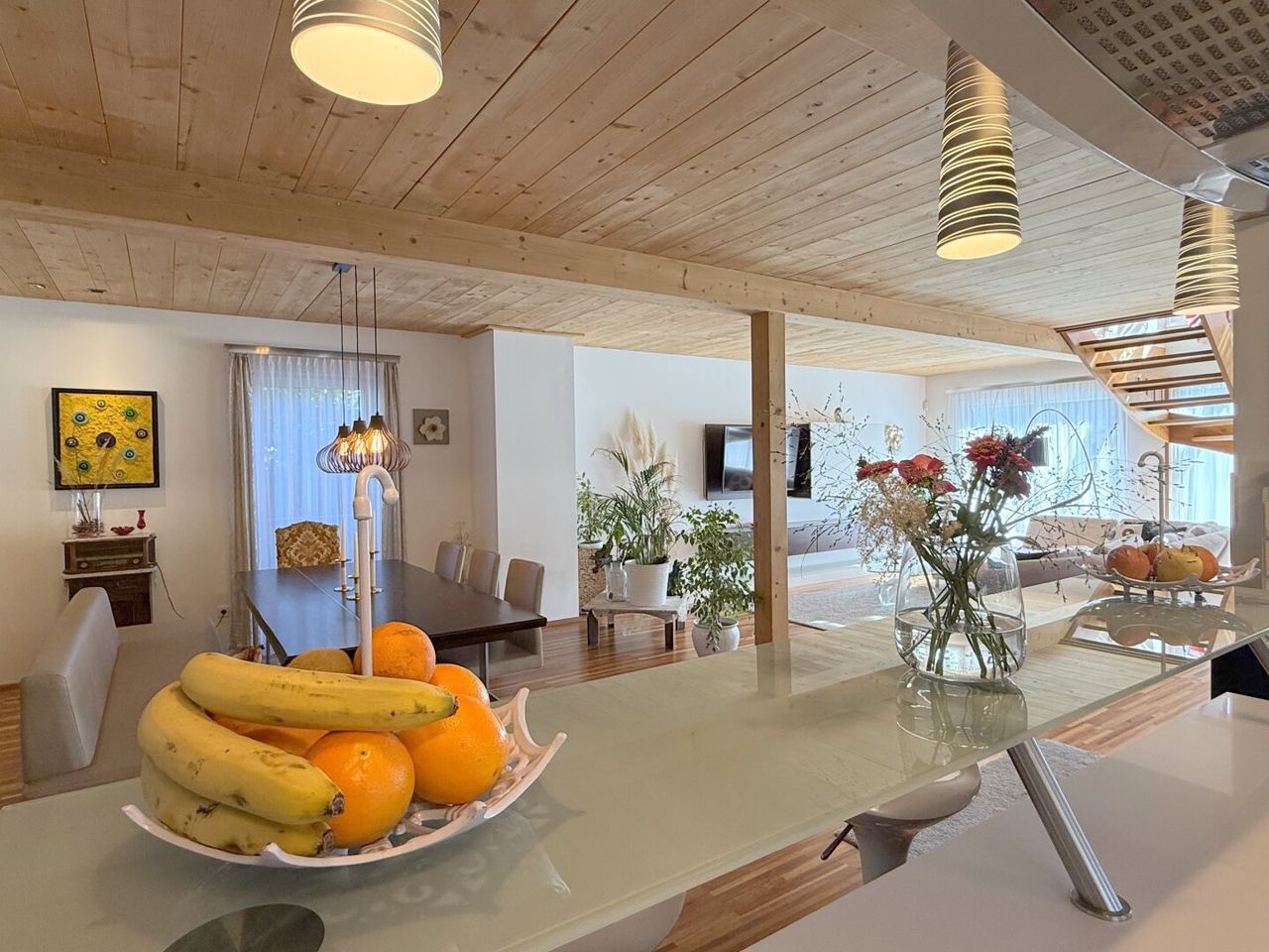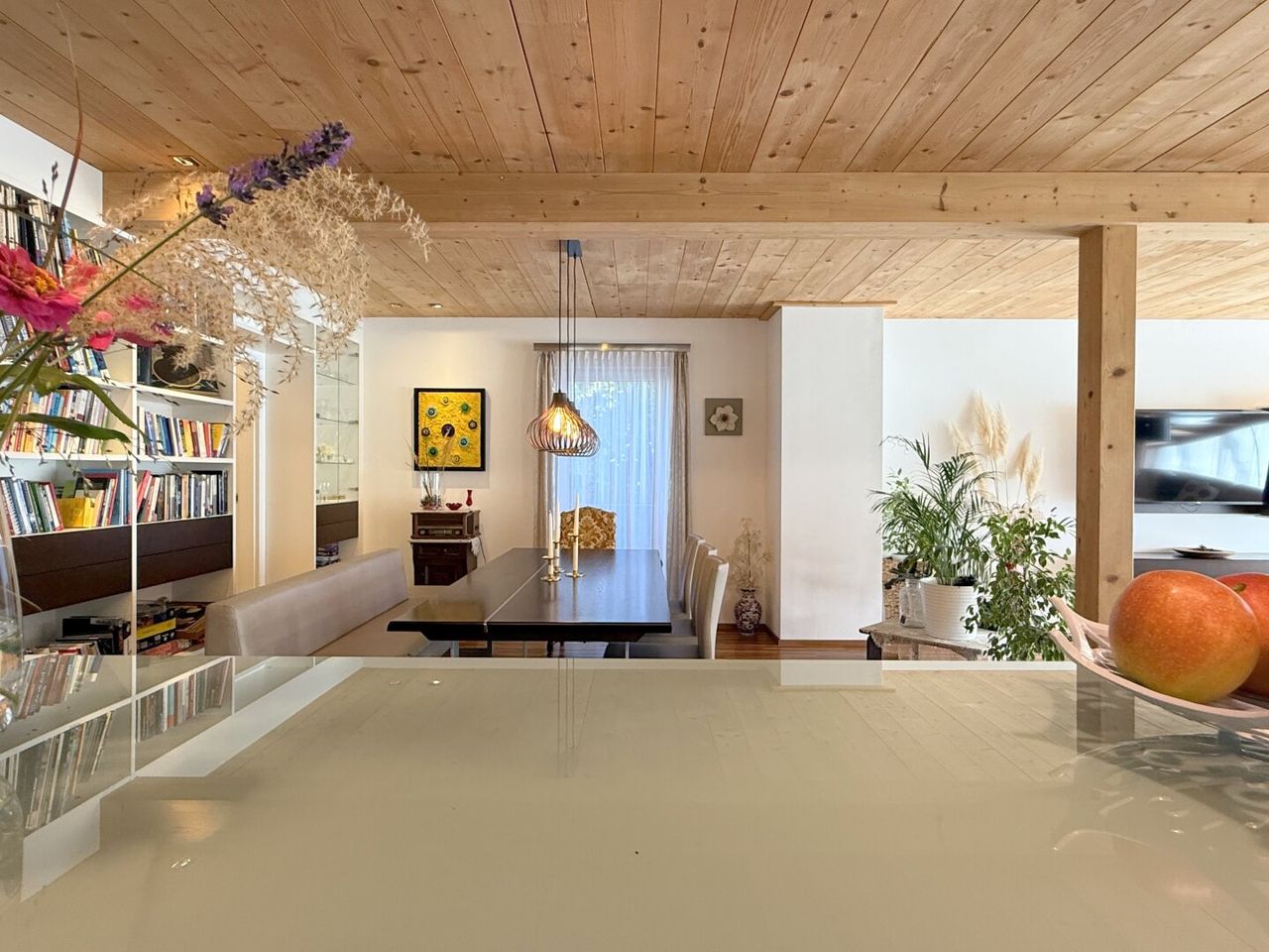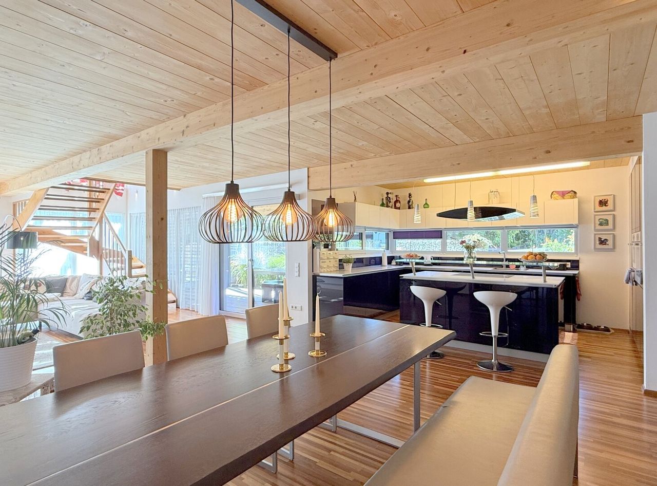 Der Esstisch vis-a-vis des Küchenzaubers ist mehr als ein Möbelstück – er ist Bühne für Begegnungen. Der Wohnbereich angrenzend, fast sakral in seiner Weite, öffnet sich nach Süden und Westen. Licht fällt auf Parkettboden und Holztramdecke, Schatten tanzen über die Wände, die Verglasung verschmilzt Innen und Außen. Jede Ecke erzählt von Sorgfalt, jede Linie von Design.