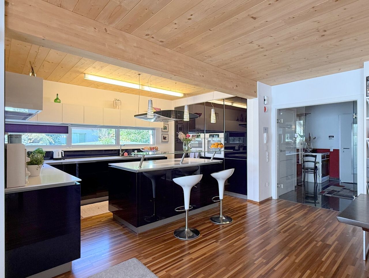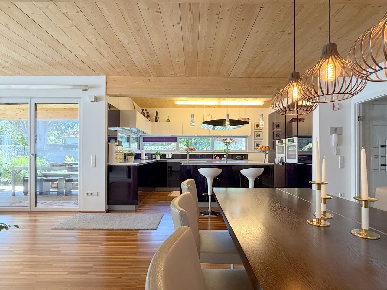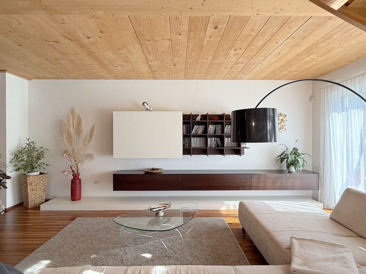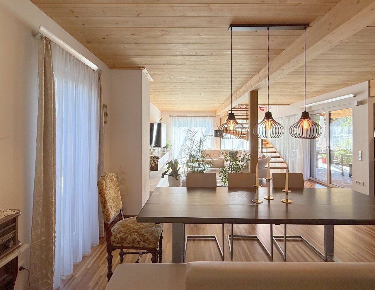 Der Esstisch vis-a-vis des Küchenzaubers ist mehr als ein Möbelstück – er ist Bühne für Begegnungen. Der Wohnbereich angrenzend, fast sakral in seiner Weite, öffnet sich nach Süden und Westen. Licht fällt auf Parkettboden und Holztramdecke, Schatten tanzen über die Wände, die Verglasung verschmilzt Innen und Außen. Jede Ecke erzählt von Sorgfalt, jede Linie von Design.