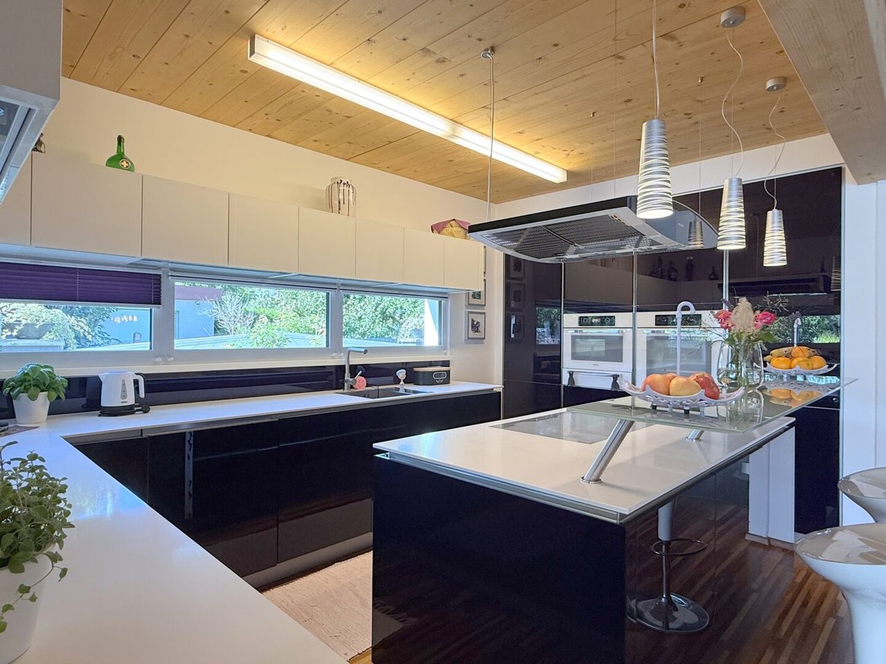 Die Küche ist mehr als ein Raum, sie ist ein Atelier, ein künstlerischer Ausdruck. Lila. Nicht irgendein Lila, sondern satt, lebendig, kühn. Die grifflose Küche mit Fronten aus Designglas verfügt über Dampfgarer, Tellerwärmer und einen Induktionsherd von Miele.