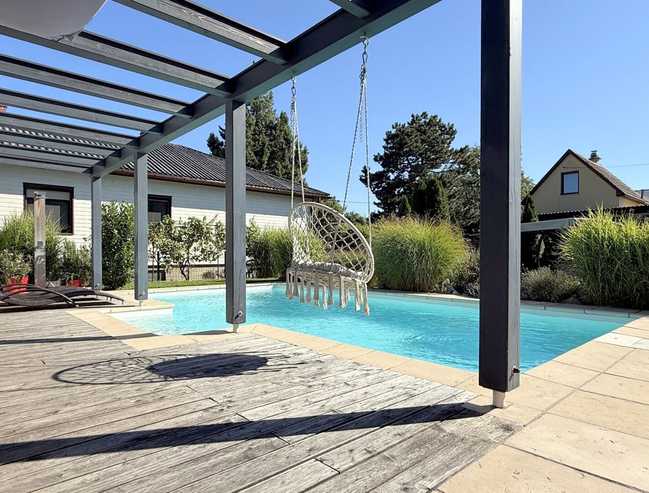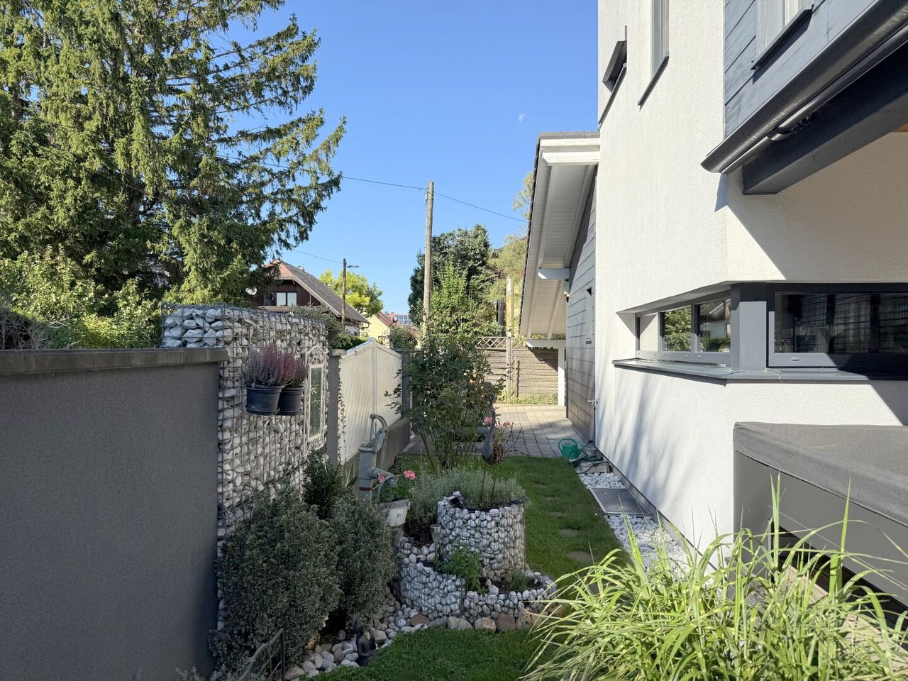Der Garten ist wahrlich eine choreografierte Landschaft, in der Licht und Schatten wie Tänzer über Beete, Bonsaibäume und Ziergräser gleiten. Jeder Pfad führt zu kleinen Oasen – ein lauschiges Plätzchen zum Lesen, ein sonniger Fleck zum Entspannen, ein versteckter Winkel zum Träumen. Die Kräuterschnecke vor der Küchenterrasse duftet wie ein kleines, kulinarisches Gedicht, während die Pergola sanfte Schatten über Pool und Terrasse wirft. Alles ist arrangiert, nichts dem Zufall überlassen – ein lebendiges Kunstwerk, das man betreten, erleben und immer wieder neu entdecken kann.