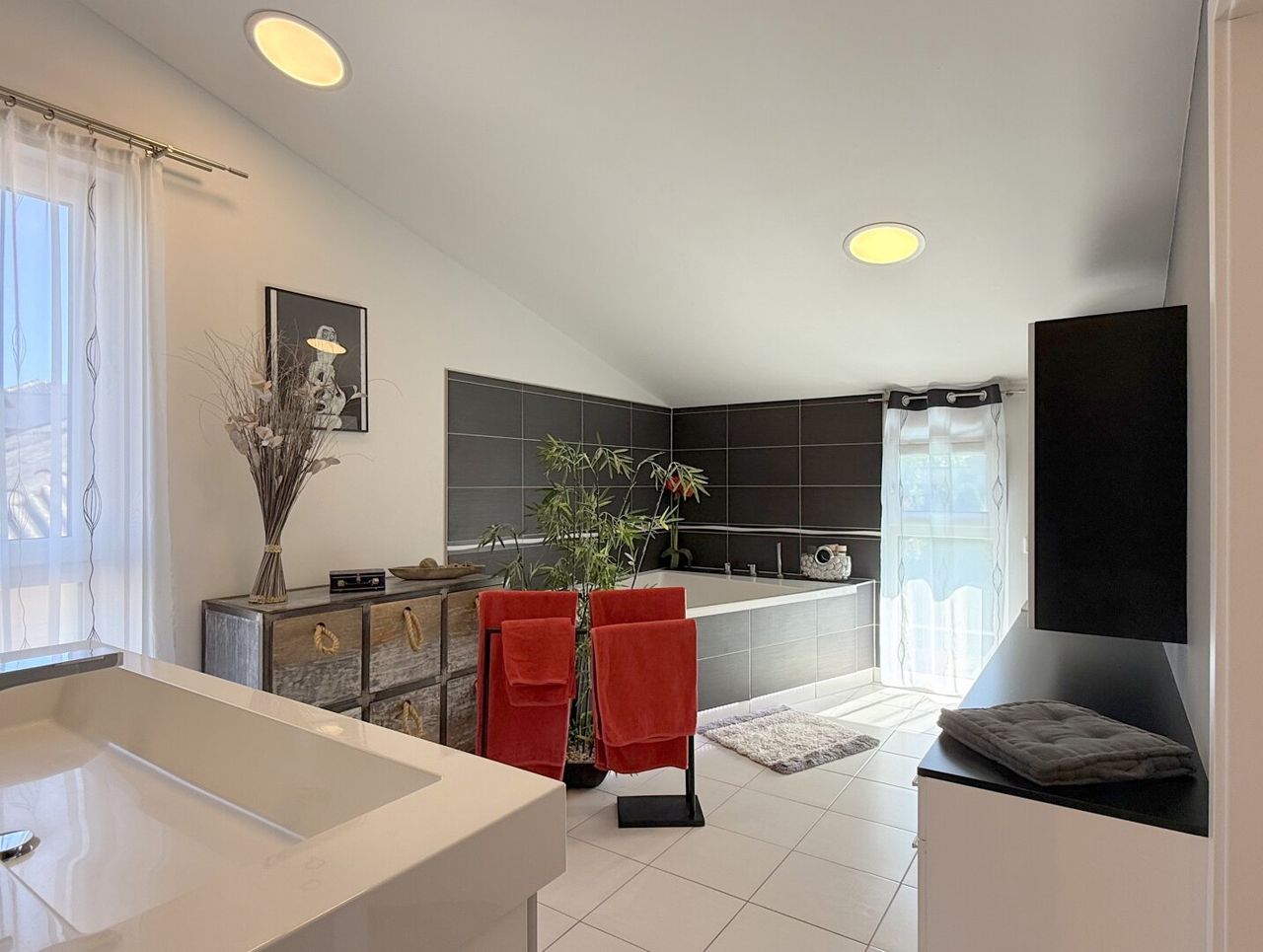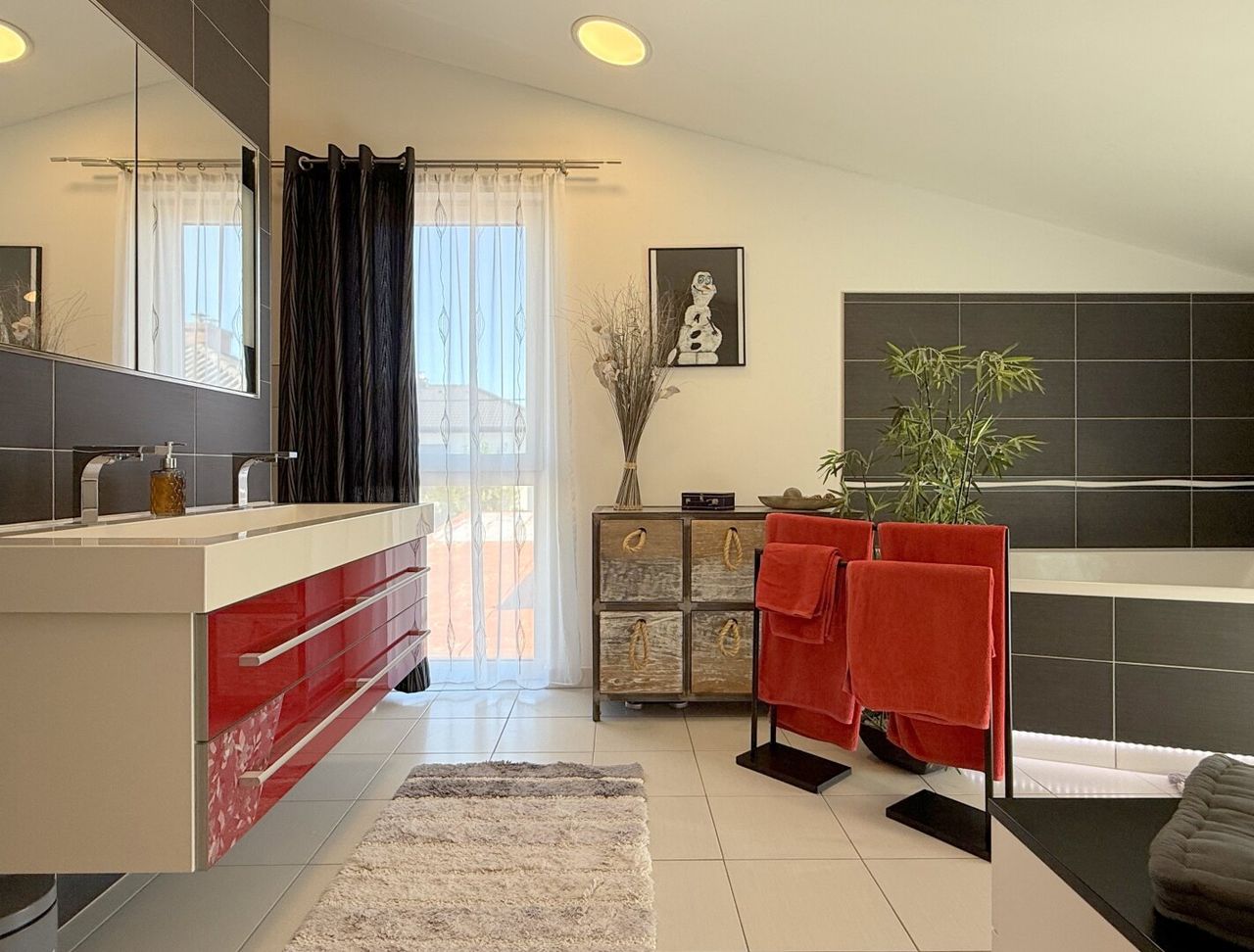 Das Badezimmer ist ein Schauspiel der Materialien: schwarz mit grau, weiß gefliest, rote Akzente wie kleine Überraschungen, Eckbadewanne, französisches Fenster. Ein Doppelwaschbecken trennt geschickt die Bereiche: links die XL-Dusche, rechts elegant versteckt die Toilette – alles wirkt durchdacht, wie ein Designstück. Licht fällt weich herein, spielt auf den Fliesen, reflektiert in den Glasflächen und schafft eine Atmosphäre des Wohlfühlens.