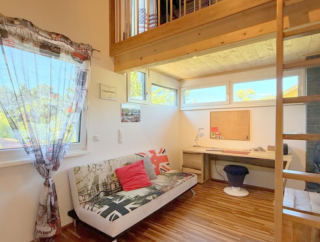 Die beiden Kinderzimmer sind kleine Universen: jeweils mit einer eingezogenen Galerie, kleine Maisonette-Zimmer, erreichbar über Leitern. Unten Spielen, Lernen, Toben, oben Schlafen und Träumen – Räume, die wachsen, die kreativ machen, die Fantasie beflügeln.