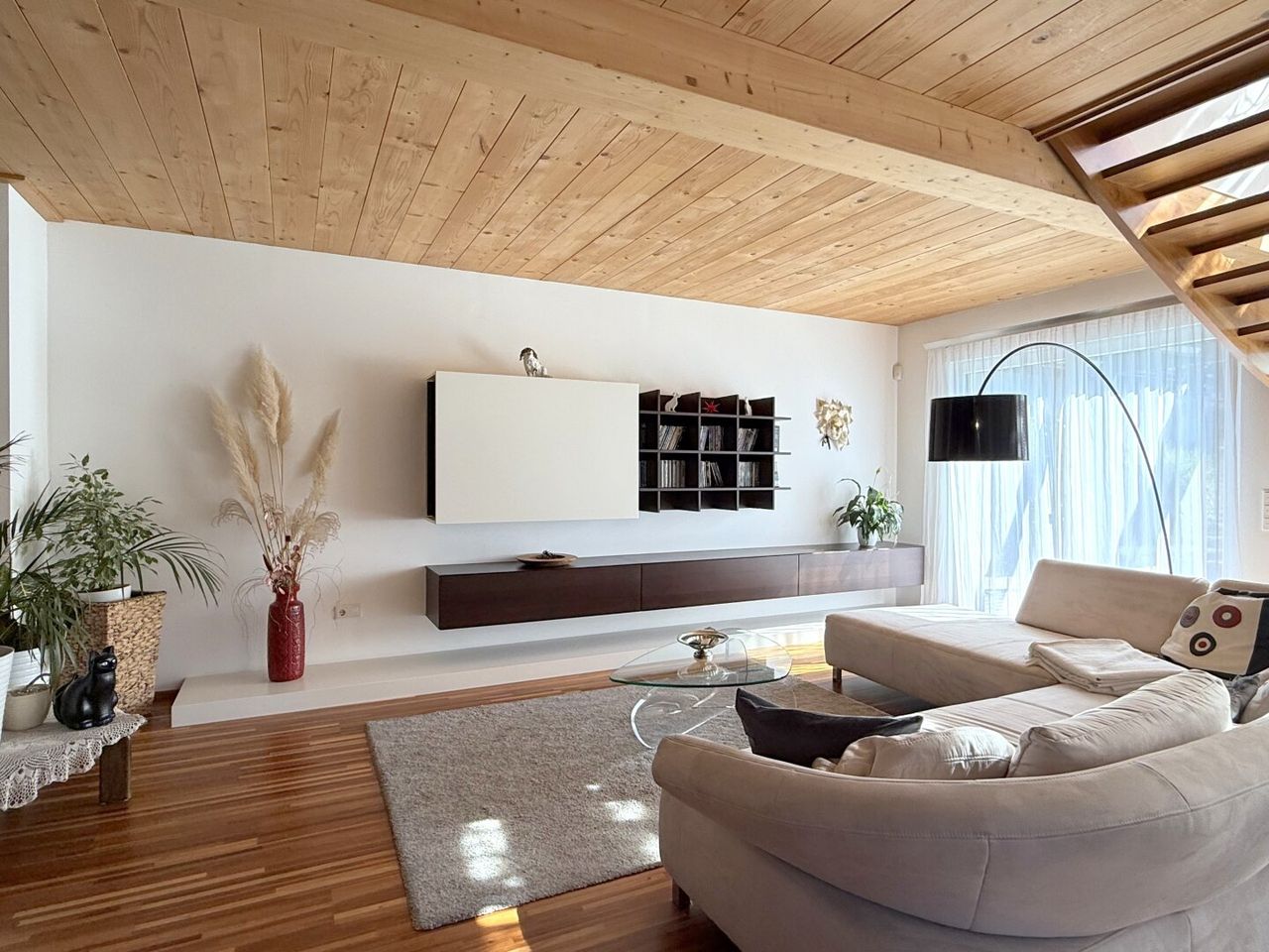Die Holztreppe im Wohnzimmer führt Sie elegant in den ersten Stock, wo Träume gebaut werden. Auch hier erwartet Sie ein besonderes Vergnügen.