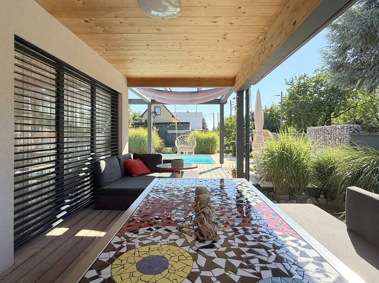 Die überdachte Terrasse, direkt vom Wohnraum zugänglich, lädt ein zu Sommernächten, Gesprächen, dem gemauerten Pool, dessen Wasser das Haus in sanftes Blau taucht. Die Pergola davor spendet Schatten, schließt sich auf Knopfdruck und öffnet sich auf ein Nicken des Windes.