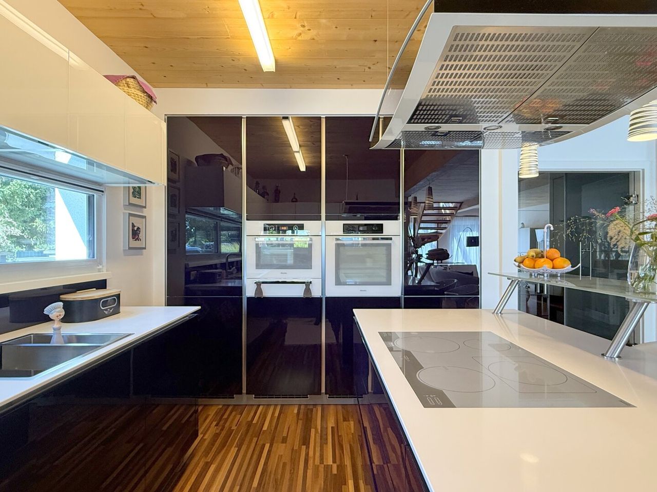 Im Vorzimmer empfängt schwarzer Fliesenboden mit glänzender Eleganz, die Garderobe, weiß wie frisch gefallener Schnee, nimmt alles auf, was man ablegt – Gedanken, Taschen, Alltägliches – und lässt den Blick frei auf das, was wirklich zählt: den Raum, der nach Leben riecht. Gleich rechts die Treppe ins Untergeschoss, geheimnisvoll wie ein geheimer Garten, doch das Herz zieht geradeaus, dorthin, wo Licht und Raum verschmelzen: ins Wohnzimmer.